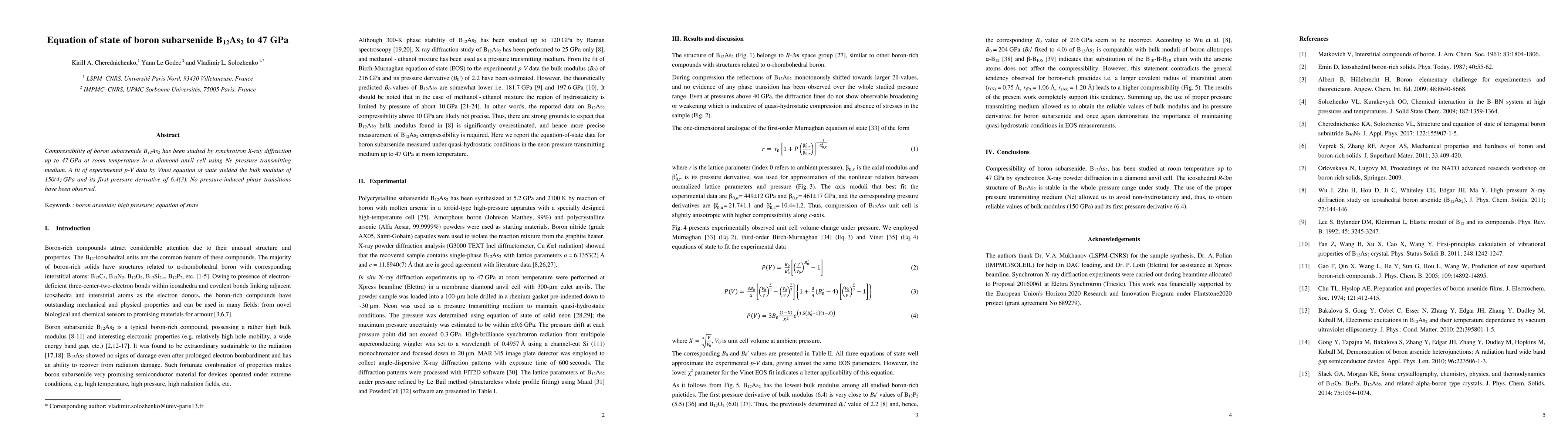 The study investigates the compressibility of boron subarsenide B12As2 up to 47 GPa using synchrotron X-ray diffraction, finding a bulk modulus of 150(4) GPa and a first pressure derivative of 6.4(3), with no phase transitions observed.