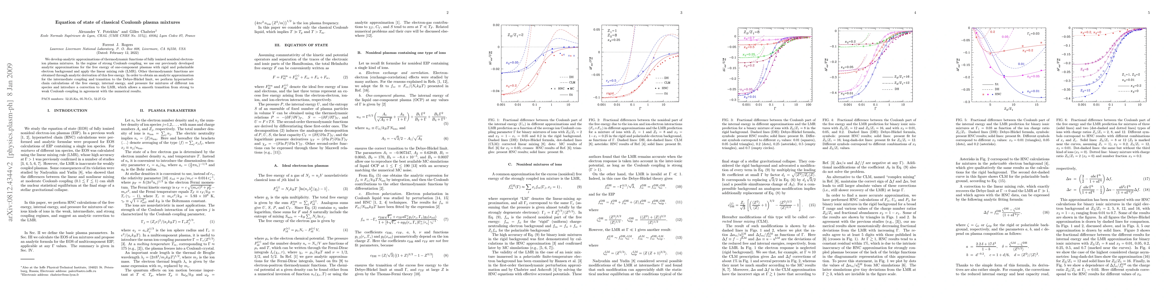 This research paper presents analytic approximations for the thermodynamic functions of fully ionized, nonideal electron-ion plasma mixtures. Utilizing previous approximations for one-component plasmas and the linear mixing rule, the authors derive other functions from the free energy. For intermediate coupling and transition to the Debye-Hueckel limit, they perform hypernetted-chain calculations, introducing a correction to the linear mixing rule to smoothly connect strong and weak Coulomb coupling, in line with numerical results.