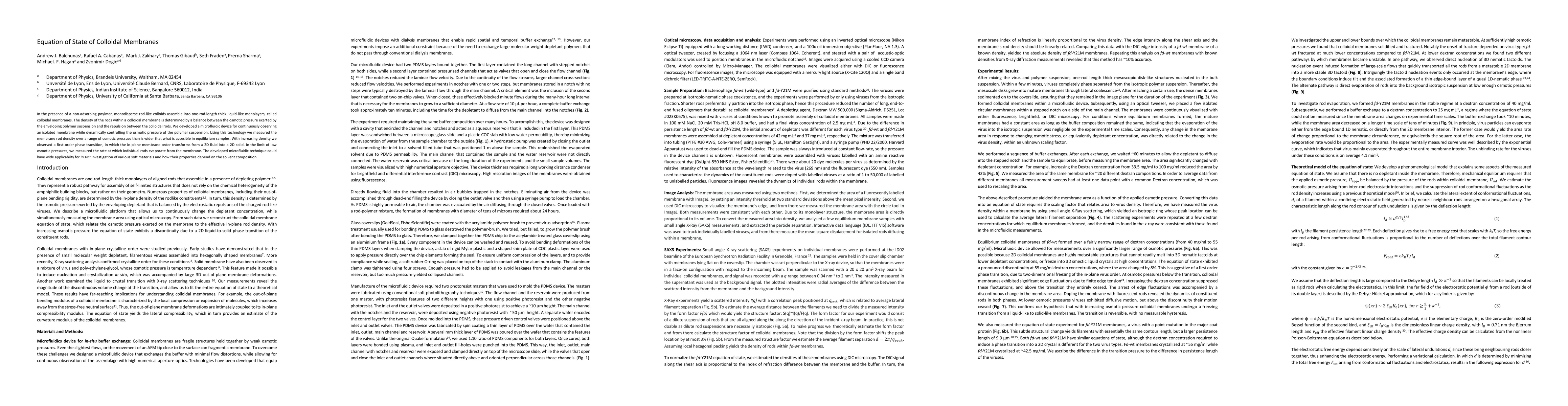 This paper investigates the equation of state of colloidal membranes formed by rod-like colloids under the influence of non-adsorbing polymers, revealing a first-order phase transition from fluid to solid with increasing density. The authors developed a microfluidic device to dynamically control osmotic pressure and measure rod density, demonstrating potential for studying soft materials' solvent composition dependence.