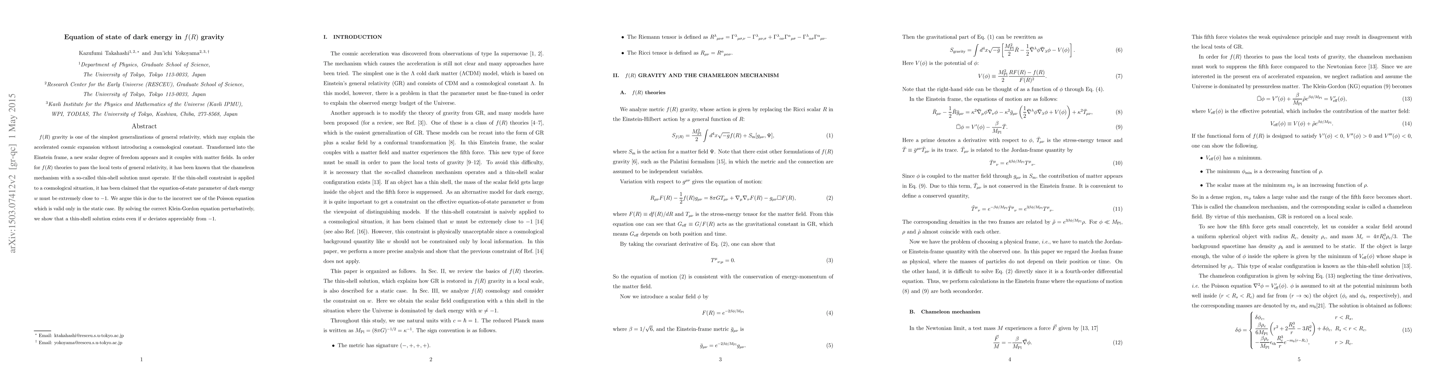 f(R) gravity is one of the simplest generalizations of general relativity, which may explain the accelerated cosmic expansion without introducing a cosmological constant. Transformed into the Einstein frame, a new scalar degree of freedom appears and it couples with matter fields. In order for f(R) theories to pass the local tests of general relativity, it has been known that the chameleon mechanism with a so-called thin-shell solution must operate. If the thin-shell constraint is applied to a cosmological situation, it has been claimed that the equation-of-state parameter of dark energy w must be extremely close to -1. We argue this is due to the incorrect use of the Poisson equation which is valid only in the static case. By solving the correct Klein-Gordon equation perturbatively, we show that a thin-shell solution exists even if w deviates appreciably from -1.