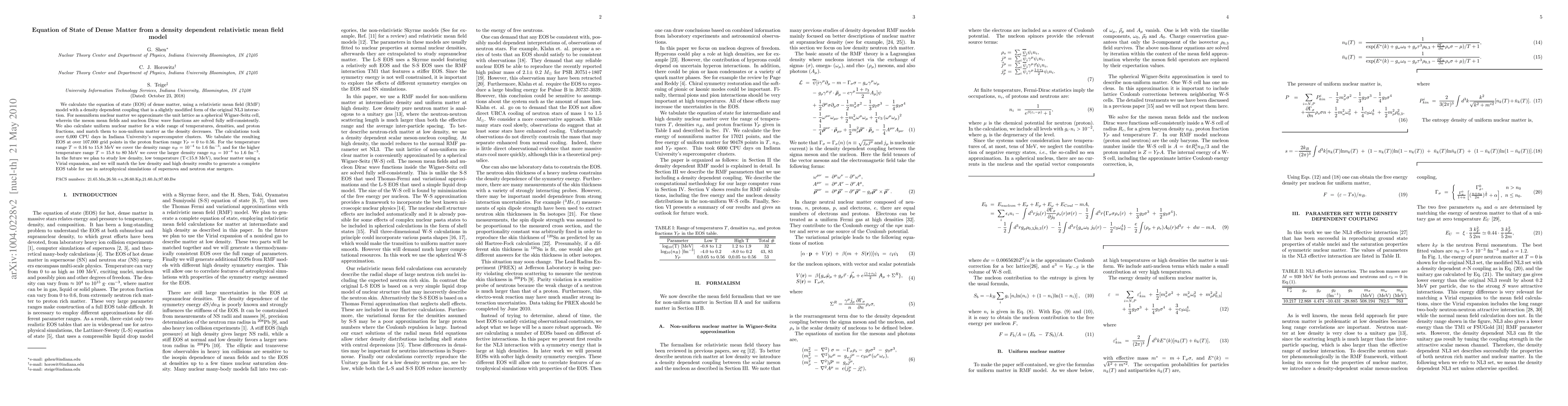 This paper calculates the equation of state (EoS) for dense matter using a relativistic mean field model with density-dependent coupling. The study covers a wide range of temperatures, densities, and proton fractions, and matches non-uniform to uniform nuclear matter, requiring extensive computational resources.