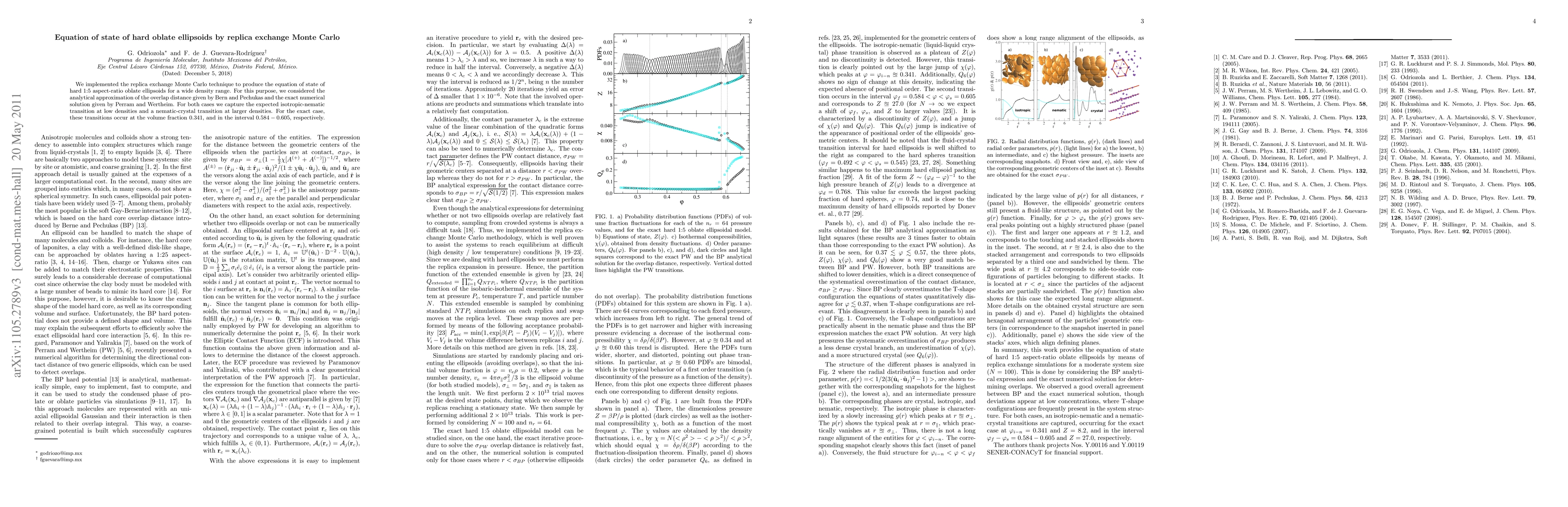 This paper uses replica exchange Monte Carlo to determine the equation of state for hard oblate ellipsoids with a 1:5 aspect ratio across a broad density range. It identifies transitions from isotropic to nematic phases at low densities and from nematic to crystal phases at higher densities, with exact transitions occurring at volume fractions 0.341 and 0.584-0.605.
