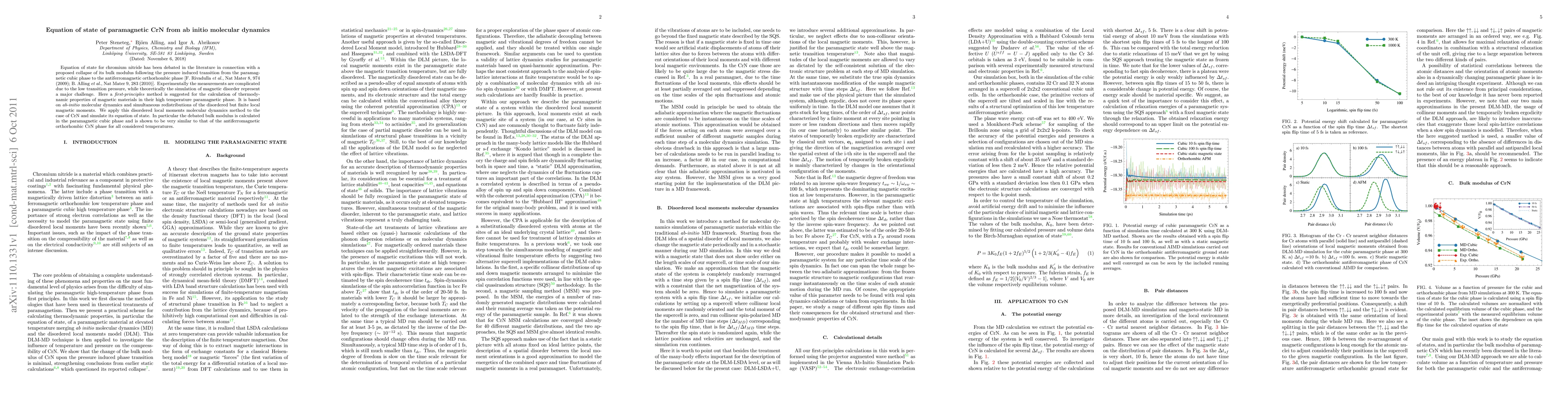 This paper uses ab initio molecular dynamics to calculate the equation of state for paramagnetic CrN, finding that its bulk modulus in the cubic phase closely matches that of the antiferromagnetic orthorhombic phase, challenging previous claims of a collapse in bulk modulus upon phase transition.
