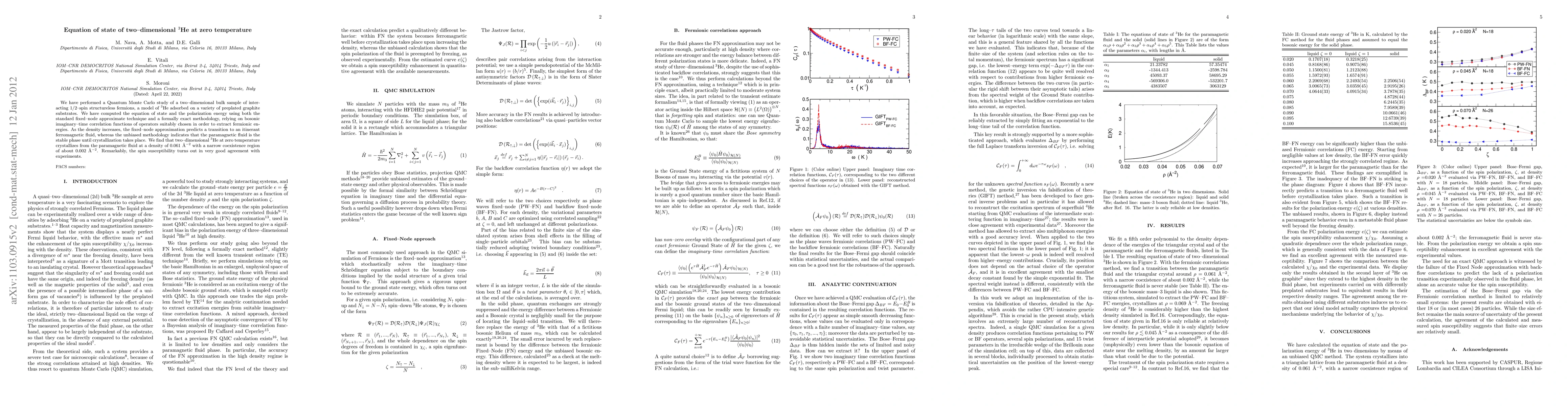 We have performed a Quantum Monte Carlo study of a two-dimensional bulk sample of interacting 1/2-spin structureless fermions, a model of $^3$He adsorbed on a variety of preplated graphite substrates. We have computed the equation of state and the polarization energy using both the standard fixed-node approximate technique and a formally exact methodology, relying on bosonic imaginary-time correlation functions of operators suitably chosen in order to extract fermionic energies. As the density increases, the fixed-node approximation predicts a transition to an itinerant ferromagnetic fluid, whereas the unbiased methodology indicates that the paramagnetic fluid is the stable phase until crystallization takes place. We find that two-dimensional $^3$He at zero temperature crystallizes from the paramagnetic fluid at a density of 0.061 \AA$^{-2}$ with a narrow coexistence region of about 0.002 \AA$^{-2}$. Remarkably, the spin susceptibility turns out in very good agreement with experiments.