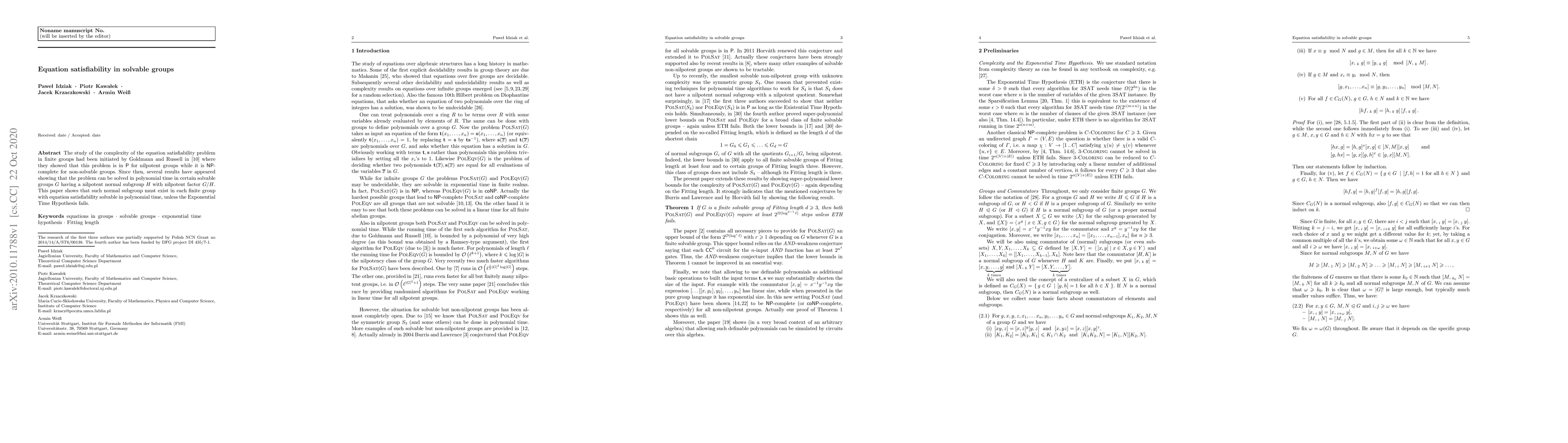 The study of the complexity of the equation satisfiability problem in finite groups had been initiated by Goldmann and Russell (2002) where they showed that this problem is in polynomial time for nilpotent groups while it is NP-complete for non-solvable groups. Since then, several results have appeared showing that the problem can be solved in polynomial time in certain solvable groups $G$ having a nilpotent normal subgroup $H$ with nilpotent factor $G/H$. This paper shows that such normal subgroup must exist in each finite group with equation satisfiability solvable in polynomial time, unless the Exponential Time Hypothesis fails.