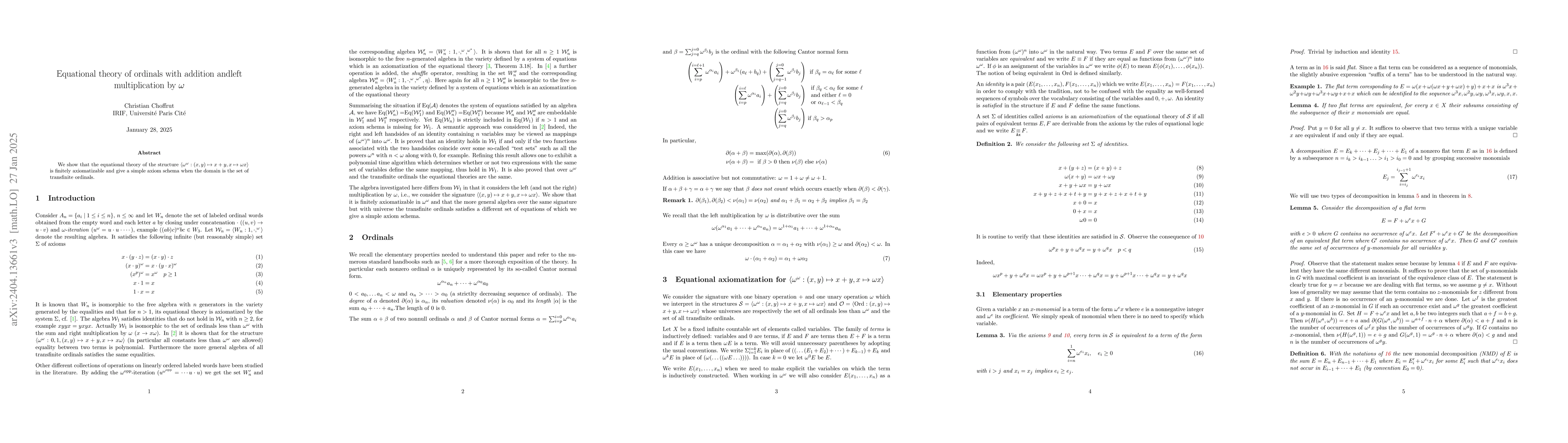 This paper proves that the equational theory of ordinals with addition and left multiplication by $\omega$ is finitely axiomatizable, providing a simple axiom schema. It also presents a linear-time algorithm for deciding term equality based on these axioms.