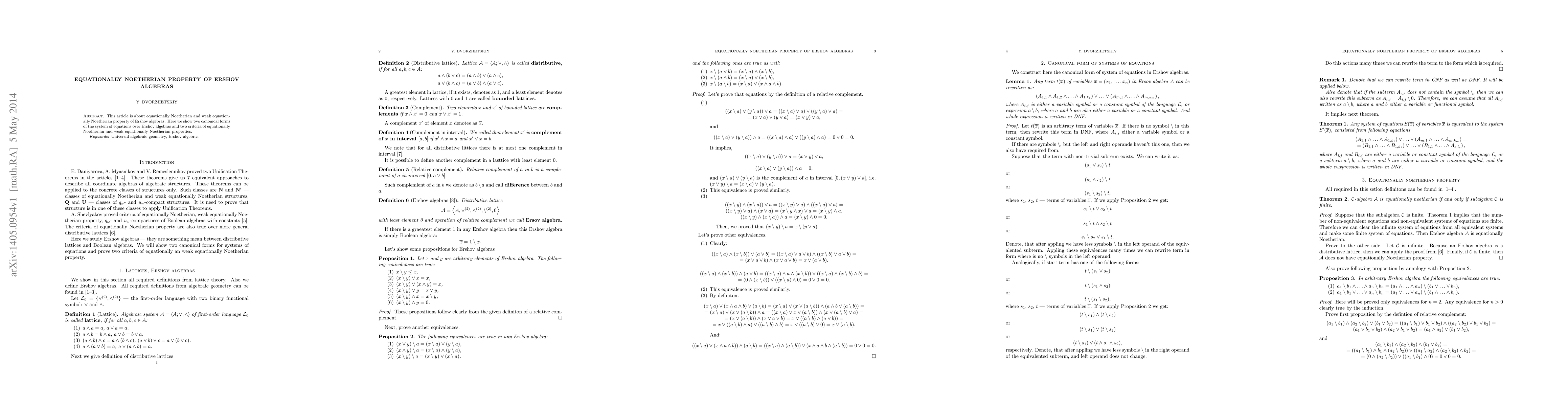 Summary: This paper investigates the equationally Noetherian and weak equationally Noetherian properties of Ershov algebras, presenting two canonical forms for systems of equations and criteria for determining these properties.