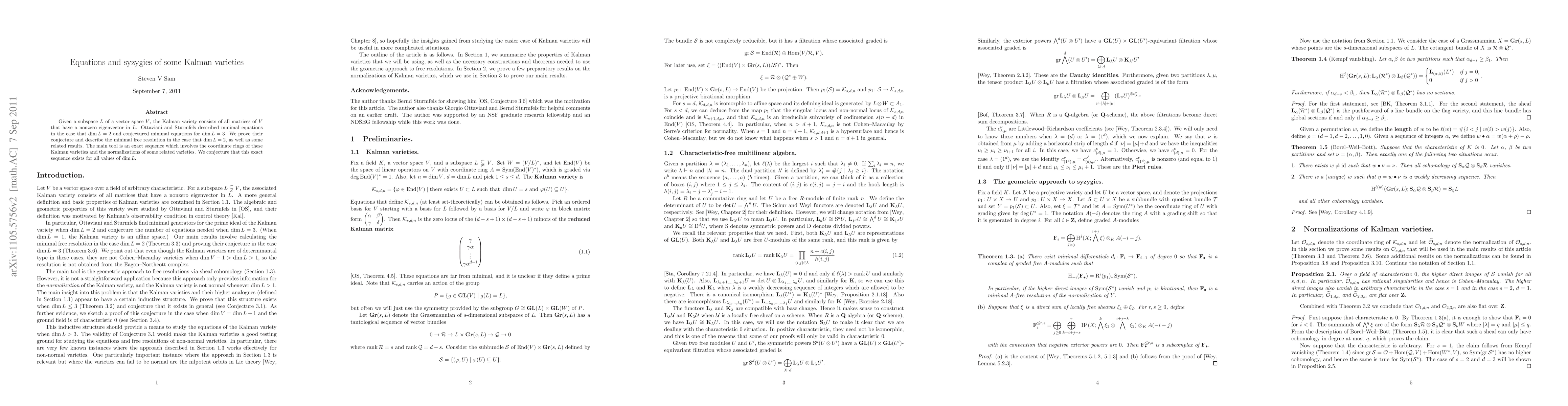 This paper proves Ottaviani and Sturmfels' conjecture regarding minimal equations for Kalman varieties when the dimension of the subspace L is 3. It also describes the minimal free resolution for dim L = 2 and proposes a conjecture about an exact sequence applicable for any dimension of L.
