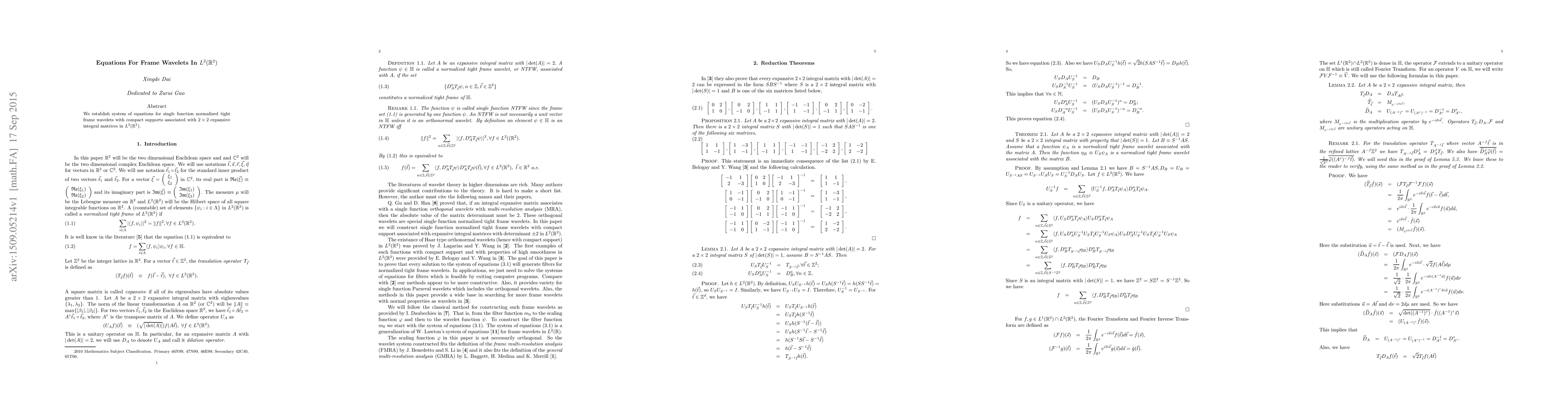 Summary: This paper develops a set of equations for normalized tight frame wavelets in $L^2(\R^2)$ that have compact supports and are linked to $2\times 2$ expansive integral matrices. The focus is on the mathematical framework underpinning these wavelets.