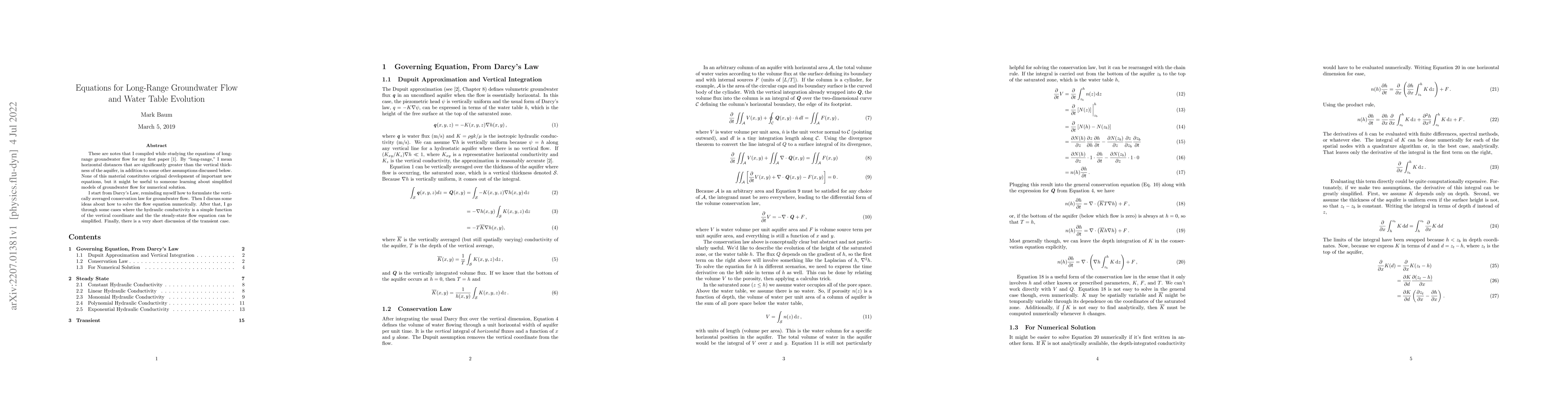These are notes that I compiled while studying the equations of long-range groundwater flow for my first paper. By "long-range," I mean horizontal distances that are significantly greater than the vertical thickness of the aquifer, in addition to some other assumptions discussed below. None of this material constitutes original development of important new equations, but it might be useful to someone learning about simplified models of groundwater flow for numerical solution. I start from Darcy's Law, reminding myself how to formulate the vertically averaged conservation law for groundwater flow. Then I discuss some ideas about how to solve the flow equation numerically. After that, I go through some cases where the hydraulic conductivity is a simple function of the vertical coordinate and the the steady-state flow equation can be simplified. Finally, there is a very short discussion of the transient case.
