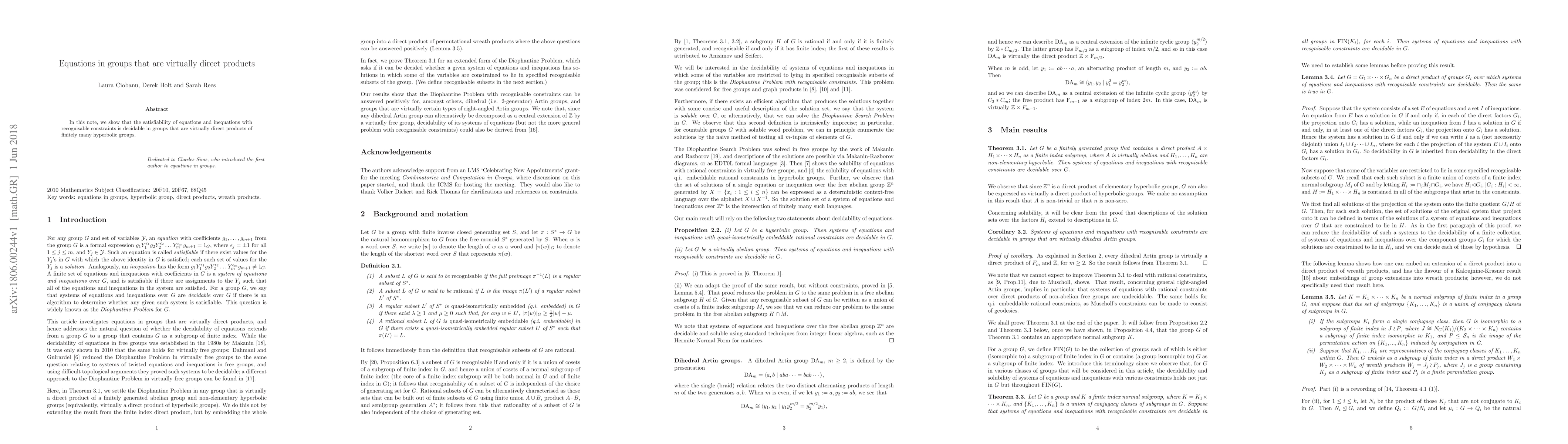In this note, we show that the satisfiability of equations and inequations with recognisable constraints is decidable in groups that are virtually direct products of finitely many hyperbolic groups.