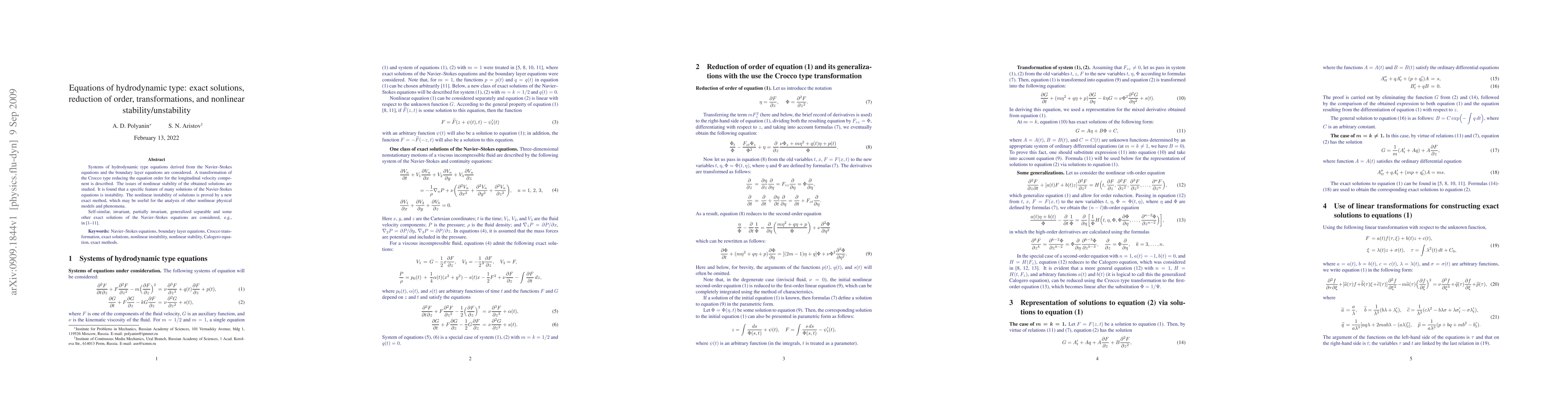 Systems of hydrodynamic type equations derived from the Navier-Stokes equations and the boundary layer equations are considered. A transformation of the Crocco type reducing the equation order for the longitudinal velocity component is described. The issues of nonlinear stability of the obtained solutions are studied. It is found that a specific feature of many solutions of the Navier-Stokes equations is instability. The nonlinear instability of solutions is proved by a new exact method, which may be useful for the analysis of other nonlinear physical models and phenomena.