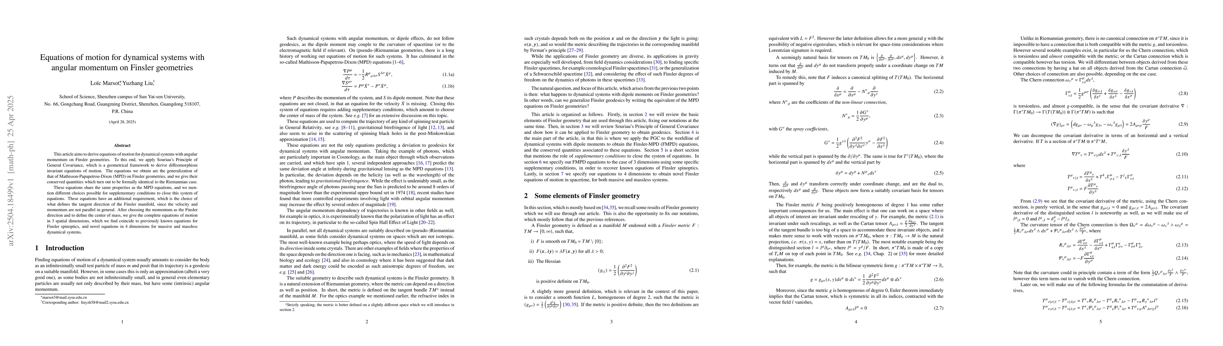 The research derives equations of motion for dynamical systems with angular momentum on Finsler geometries using Souriau's Principle of General Covariance, generalizing Mathisson-Papapetrou-Dixon equations to Finsler settings.