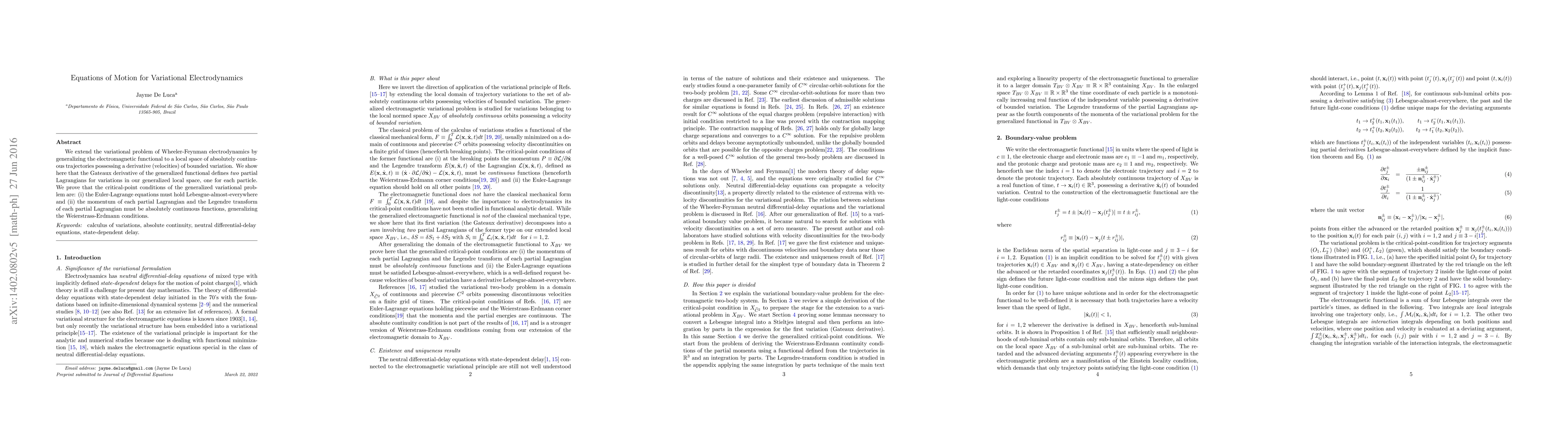 We extend the variational problem of Wheeler-Feynman electrodynamics by putting the electromagnetic functional in a local space of absolutely continuous trajectories possessing a derivative (velocities) of bounded variation. Generalizing the calculus of variations for extrema with a finite number of velocity discontinuities (breaking points), we prove that the critical-point-conditions for the two-body problem in the extended local space are Euler-Lagrange equations holding Lebesgue-almost-everywhere plus the generalized Weierstrass-Erdmann conditions that (i) the partial momenta must be absolutely continuous functions and (ii) the Legendre transforms of the partial Lagrangians (i.e, the partial energies) must be absolutely continuous functions.