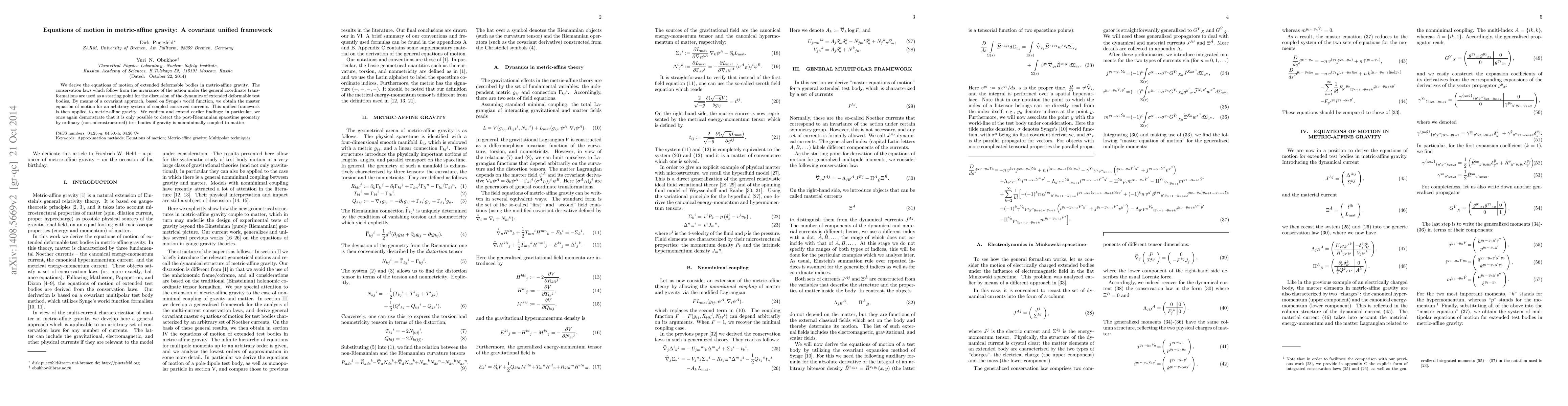 This paper derives the equations of motion for extended deformable bodies in metric-affine gravity using a covariant approach based on Synge's world function, confirming that nonminimal coupling of gravity to matter is necessary to detect post-Riemannian spacetime geometry with ordinary test bodies.