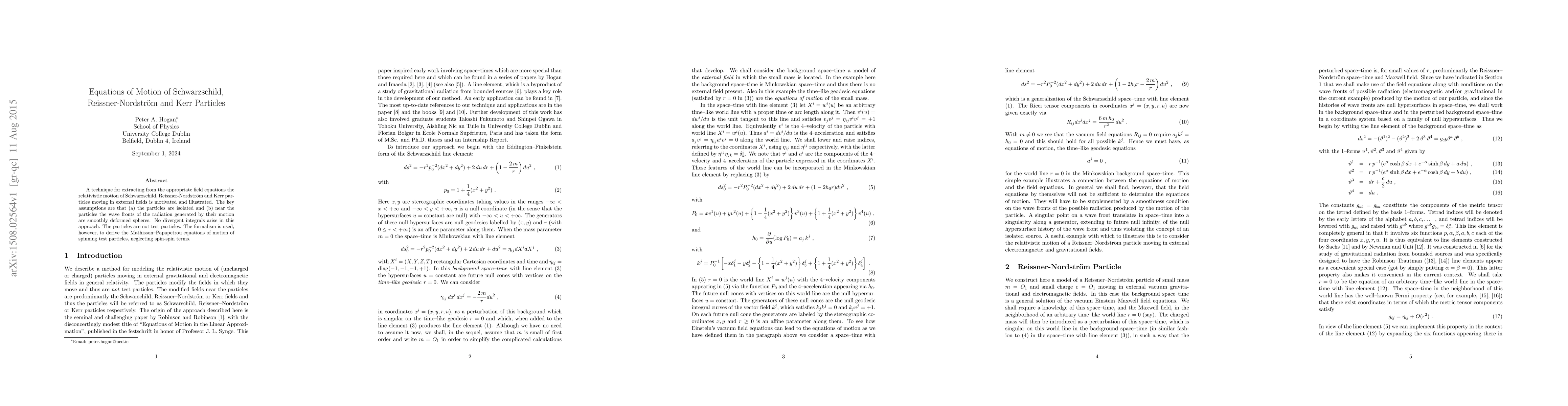 A technique for extracting from the appropriate field equations the relativistic motion of Schwarzschild, Reissner-Nordstrom and Kerr particles moving in external fields is motivated and illustrated. The key assumptions are that (a) the particles are isolated and (b) near the particles the wave fronts of the radiation generated by their motion are smoothly deformed spheres. No divergent integrals arise in this approach. The particles are not test particles. The formalism is used, however, to derive the Mathisson-Papapetrou equations of motion of spinning test particles, neglecting spin-spin terms.