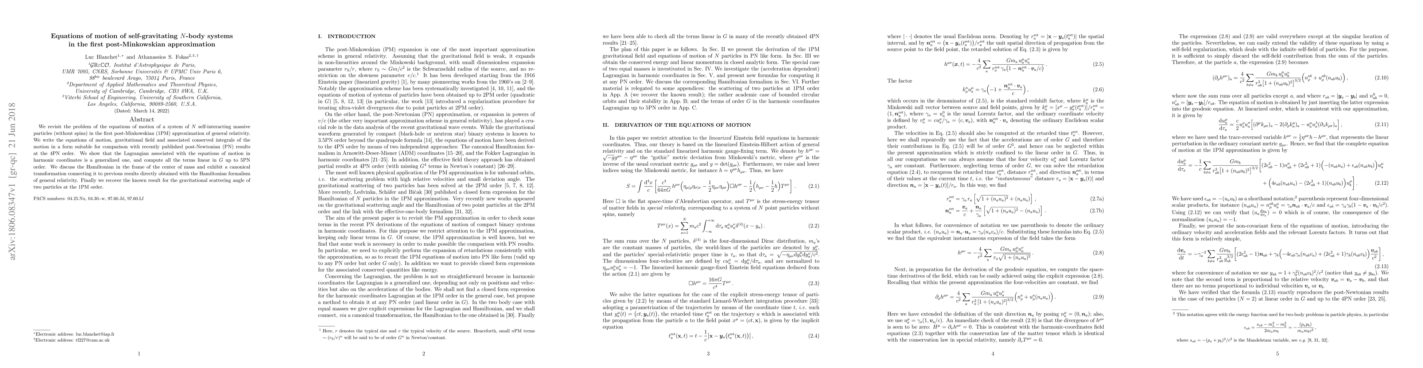 This paper derives the equations of motion for $N$ self-gravitating particles in the first post-Minkowskian approximation of general relativity, comparing them with post-Newtonian results up to 4PN order. It also computes terms linear in $G$ up to 5PN order and discusses the Hamiltonian formalism, establishing a canonical transformation to previous results.