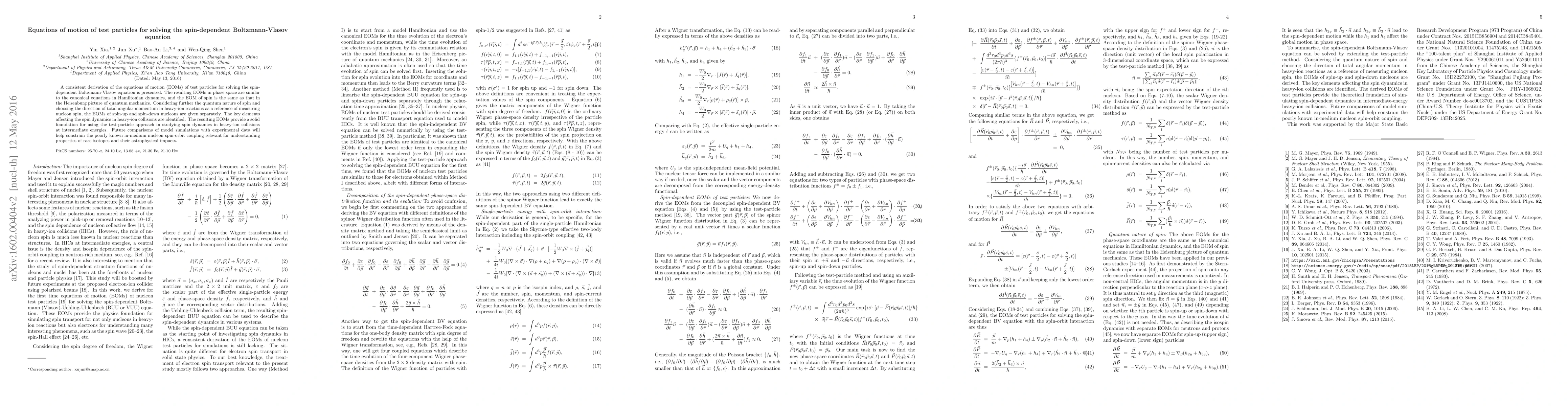 A consistent derivation of the equations of motion (EOMs) of test particles for solving the spin-dependent Boltzmann-Vlasov equation is presented. The resulting EOMs in phase space are similar to the canonical equations in Hamiltonian dynamics, and the EOM of spin is the same as that in the Heisenburg picture of quantum mechanics. Considering further the quantum nature of spin and choosing the direction of total angular momentum in heavy-ion reactions as a reference of measuring nucleon spin, the EOMs of spin-up and spin-down nucleons are given separately. The key elements affecting the spin dynamics in heavy-ion collisions are identified. The resulting EOMs provide a solid foundation for using the test-particle approach in studying spin dynamics in heavy-ion collisions at intermediate energies. Future comparisons of model simulations with experimental data will help constrain the poorly known in-medium nucleon spin-orbit coupling relevant for understanding properties of rare isotopes and their astrophysical impacts.
