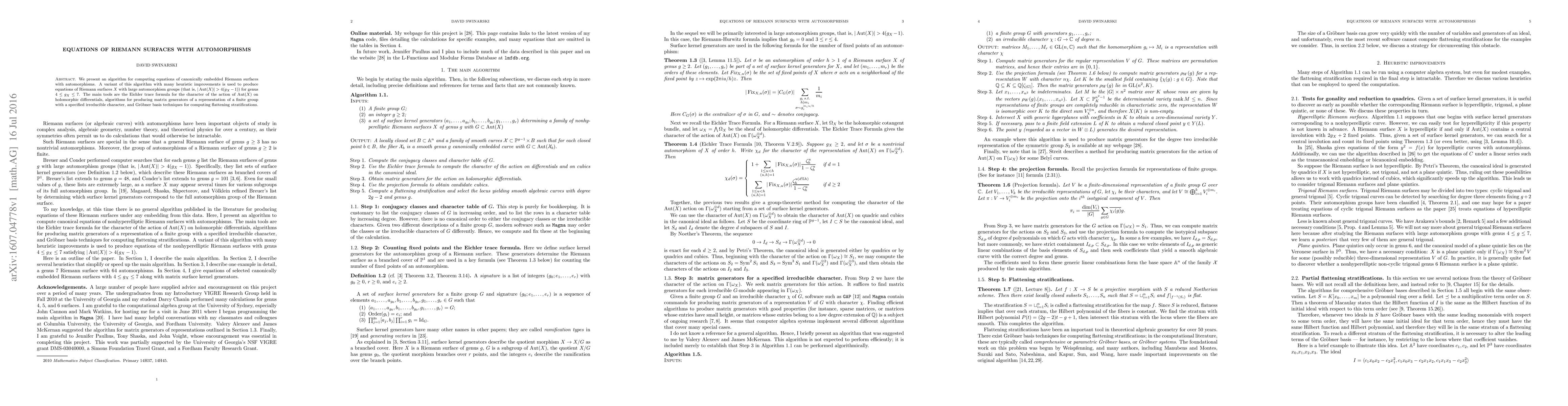 The paper presents an algorithm to compute equations for Riemann surfaces with automorphisms, employing the Eichler trace formula and Gröbner basis techniques, and it applies this to generate equations for Riemann surfaces with large automorphism groups of genus 4 to 7. Heuristic improvements enhance the algorithm's efficiency.