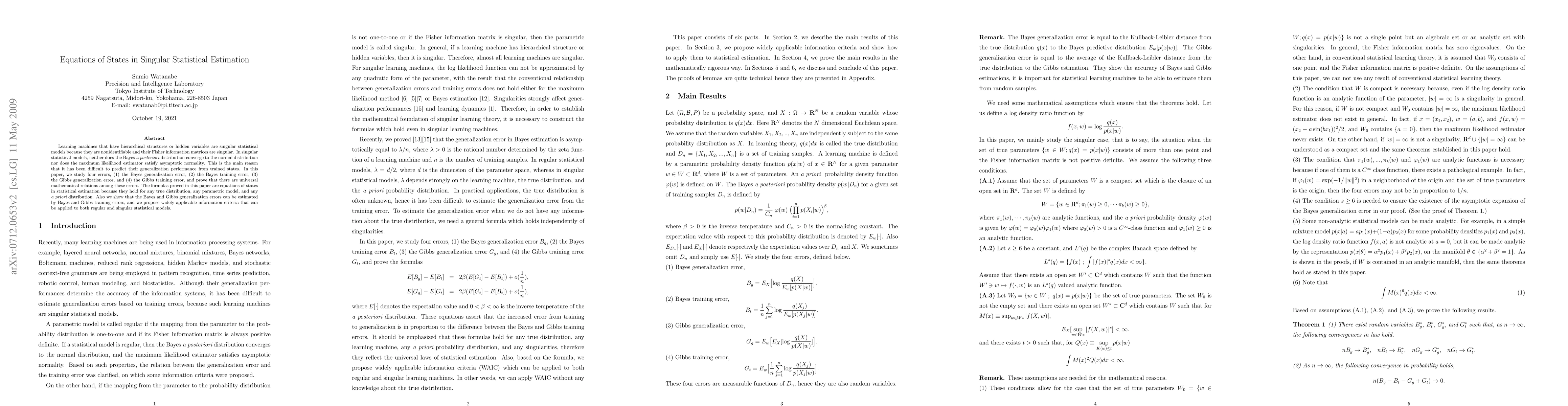 Learning machines which have hierarchical structures or hidden variables are singular statistical models because they are nonidentifiable and their Fisher information matrices are singular. In singular statistical models, neither the Bayes a posteriori distribution converges to the normal distribution nor the maximum likelihood estimator satisfies asymptotic normality. This is the main reason why it has been difficult to predict their generalization performances from trained states. In this paper, we study four errors, (1) Bayes generalization error, (2) Bayes training error, (3) Gibbs generalization error, and (4) Gibbs training error, and prove that there are mathematical relations among these errors. The formulas proved in this paper are equations of states in statistical estimation because they hold for any true distribution, any parametric model, and any a priori distribution. Also we show that Bayes and Gibbs generalization errors are estimated by Bayes and Gibbs training errors, and propose widely applicable information criteria which can be applied to both regular and singular statistical models.