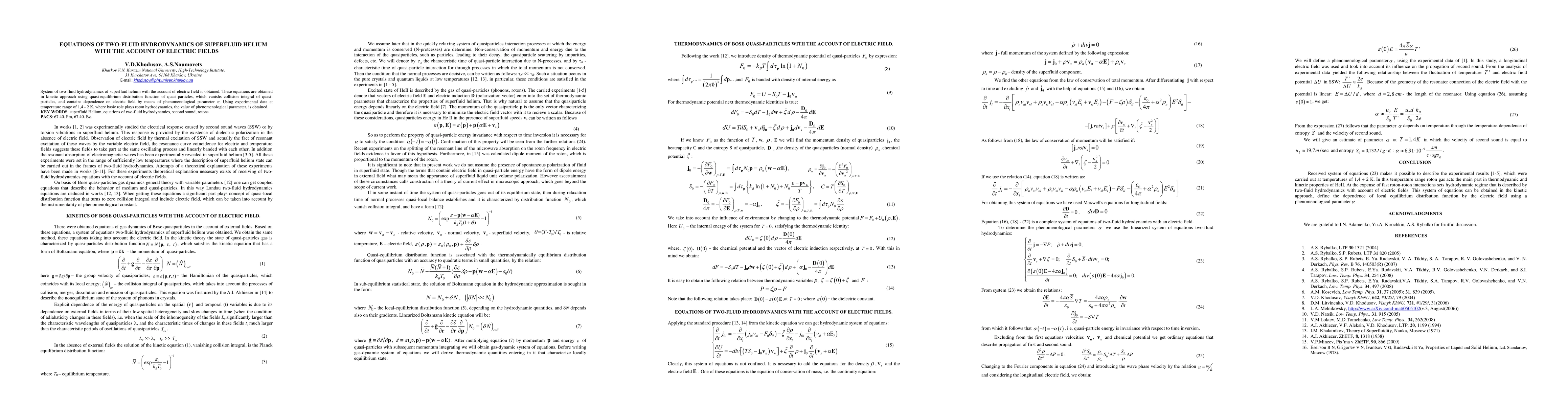 This paper derives the equations for two-fluid hydrodynamics of superfluid helium, incorporating electric fields via a phenomenological parameter. The equations are developed using a kinetic approach and validated with experimental data at temperatures between 1.4 and 2 K, focusing on roton hydrodynamics.