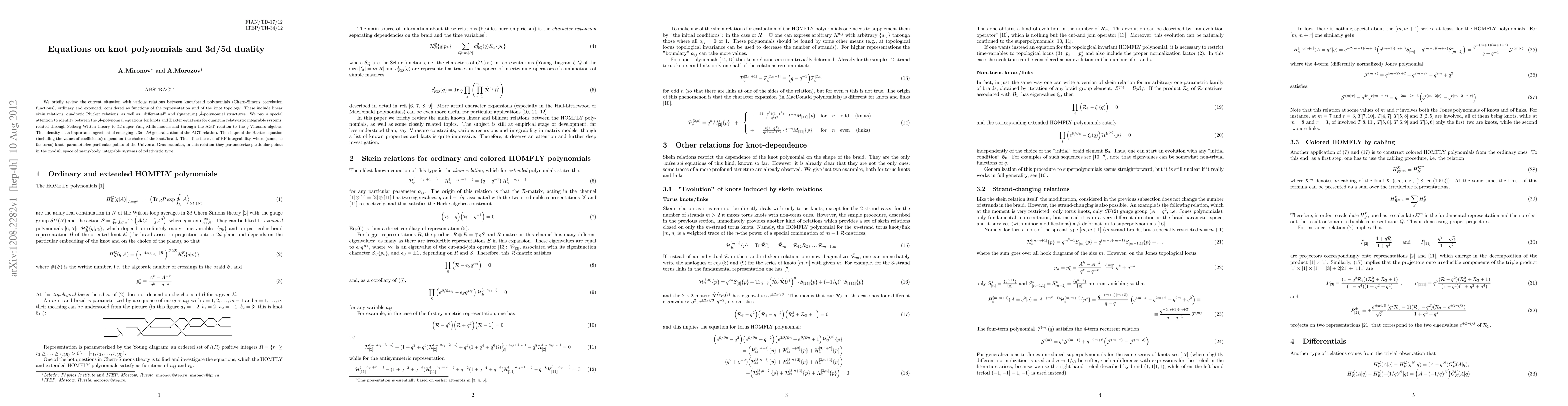 This paper explores the connections between knot polynomials and 3d/5d duality, focusing on the identity between A-polynomial equations for knots and Baxter equations for quantum relativistic integrable systems. It highlights the role of these identities in the emerging 3d-5d generalization of the AGT relation.