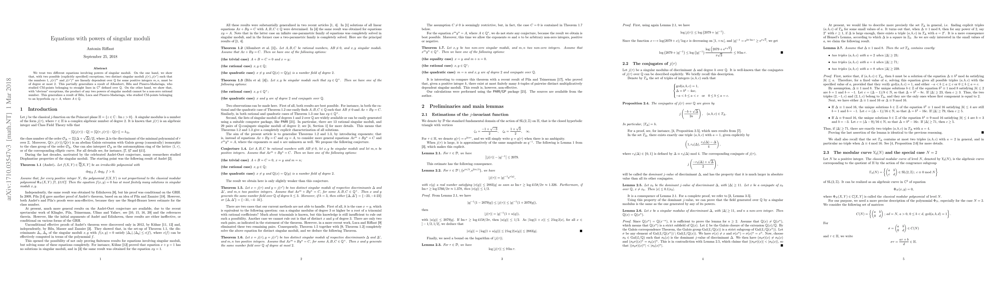 This paper investigates equations involving powers of singular moduli, proving that two distinct singular moduli must have degree at most 2 if the numbers 1, j(τ)^m, and j(τ')^n are linearly dependent over $\mathbb{Q}$ for some positive integers m,n, except for two specified exceptions. Additionally, it demonstrates that the product of any two powers of singular moduli cannot be a non-zero rational number, barring obvious exceptions.