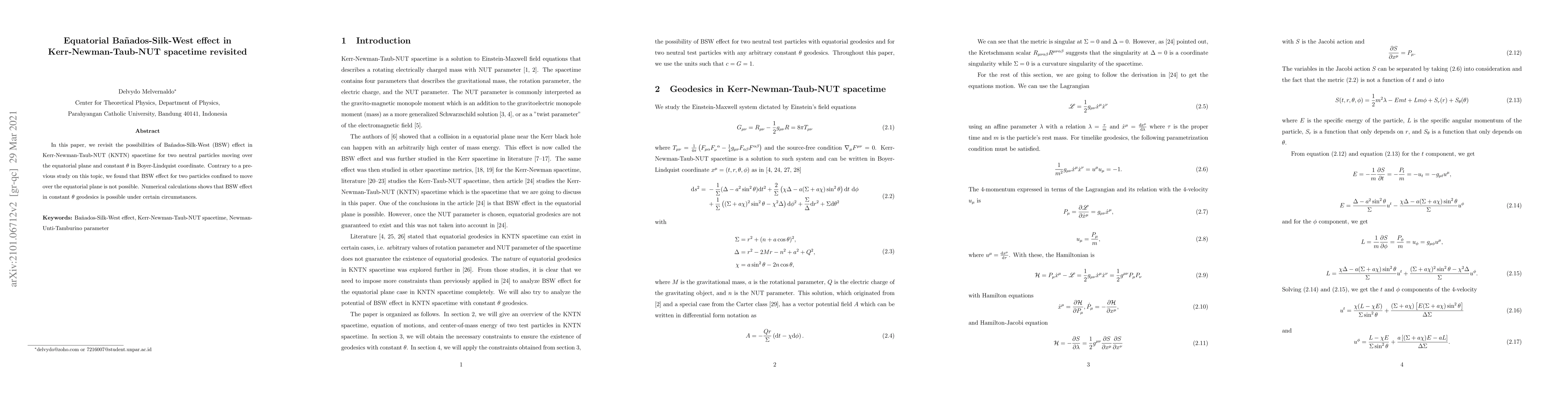 In this paper, we revisit the possibilities of Ba\~nados-Silk-West (BSW) effect in Kerr-Newman-Taub-NUT (KNTN) spacetime for two neutral particles moving over the equatorial plane and constant $\theta$ in Boyer-Lindquist coordinate. Contrary to a previous study on this topic, we found that BSW effect for two particles confined to move over the equatorial plane is not possible. Numerical calculations shows that BSW effect in constant $\theta$ geodesics is possible under certain circumstances.