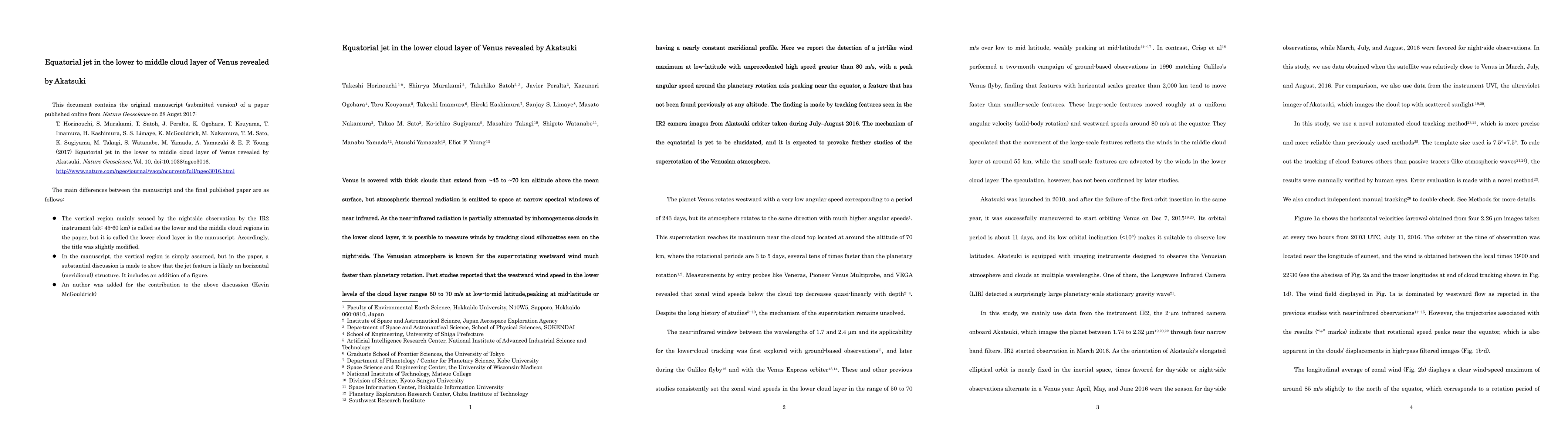 The Akatsuki orbiter's IR2 camera detected winds exceeding 80 m/s at low latitudes on Venus, suggesting an equatorial jet. This observation, made in July and August 2016, reveals variability in zonal flow in the planet's lower and middle cloud regions, offering insights into Venus' atmospheric superrotation dynamics.