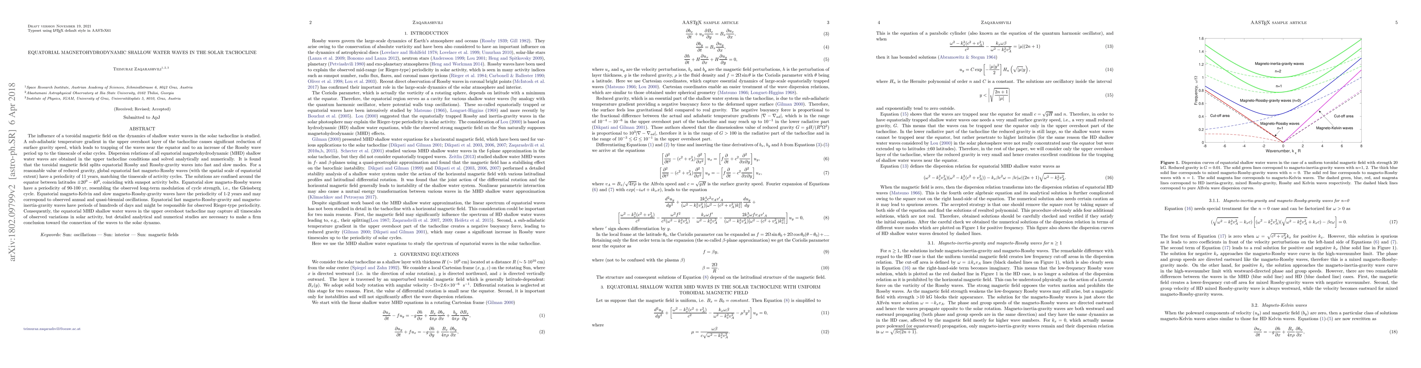 This paper investigates the dynamics of equatorial magnetohydrodynamic shallow water waves in the solar tachocline, showing that a toroidal magnetic field splits these waves into fast and slow modes. The study finds that these waves may correspond to various observed periodicities in solar activity, including the 11-year solar cycle and the Gleissberg cycle.