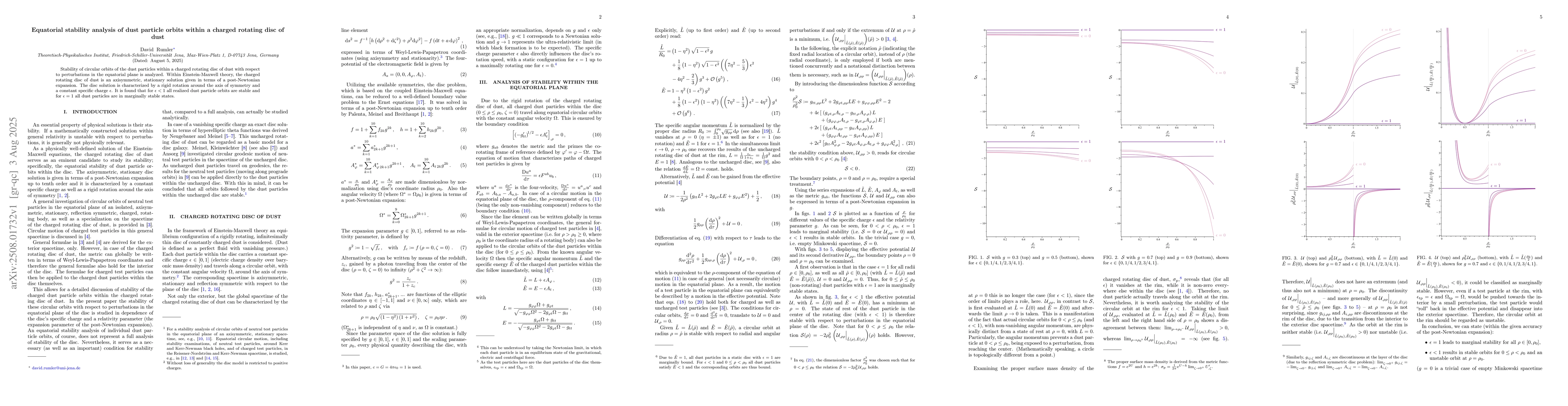 Stability of circular orbits of the dust particles within a charged rotating disc of dust with respect to perturbations in the equatorial plane is analyzed. Within Einstein-Maxwell theory, the charged rotating disc of dust is an axisymmetric, stationary solution given in terms of a post-Newtonian expansion. The disc solution is characterized by a rigid rotation around the axis of symmetry and a constant specific charge $\epsilon$. It is found that for $\epsilon<1$ all realized dust particle orbits are stable and for $\epsilon=1$ all dust particles are in marginally stable states.