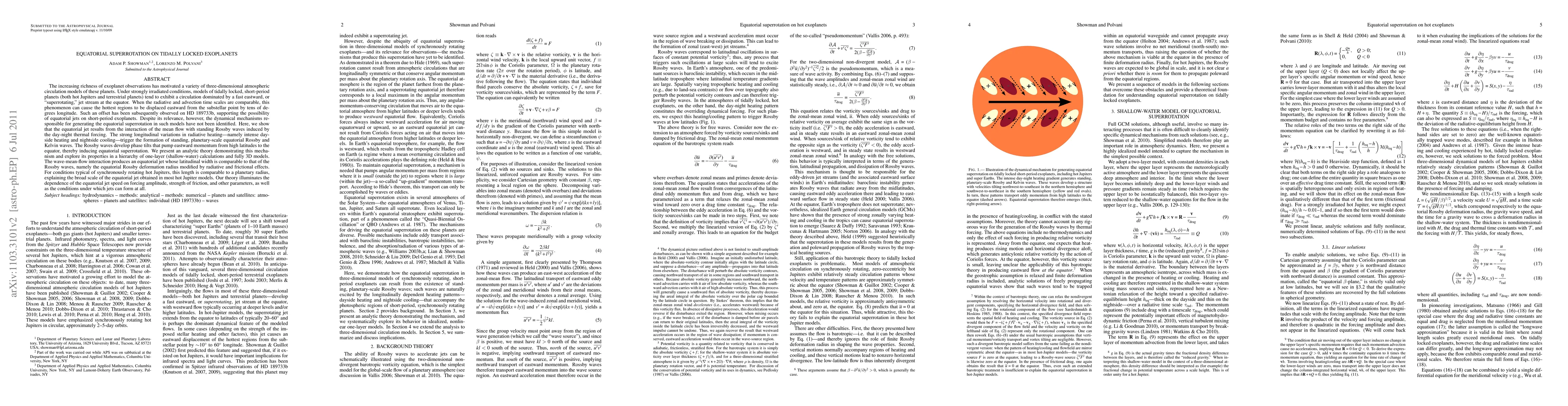 This paper investigates the equatorial superrotation phenomenon in tidally locked exoplanets, demonstrating that it arises from the interaction between the mean atmospheric flow and standing Rossby and Kelvin waves generated by day-night thermal forcing. The study provides an analytic theory and computational models to show how these waves transfer momentum to the equator, creating a broad, fast-moving equatorial jet.