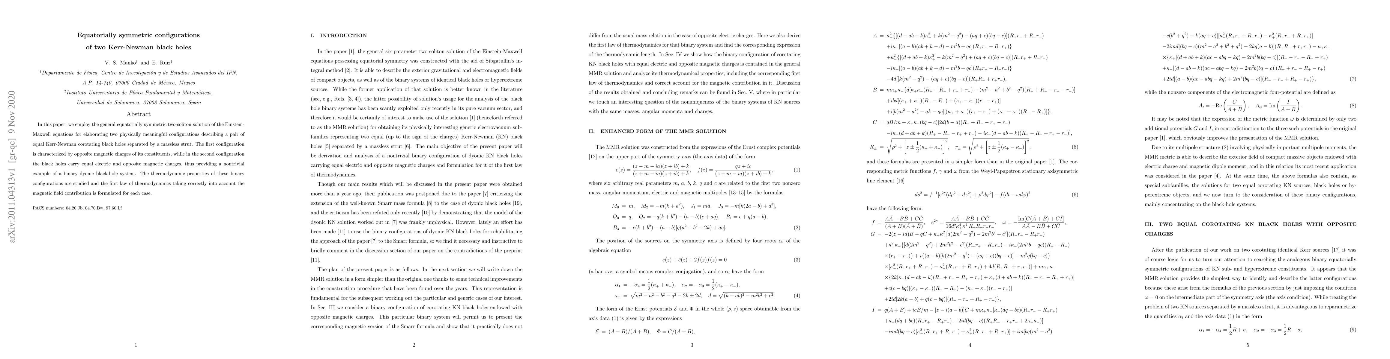 In this paper, we employ the general equatorially symmetric two-soliton solution of the Einstein-Maxwell equations for elaborating two physically meaningful configurations describing a pair of equal Kerr-Newman corotating black holes separated by a massless strut. The first configuration is characterized by opposite magnetic charges of its constituents, while in the second configuration the black holes carry equal electric and opposite magnetic charges, thus providing a nontrivial example of a binary dyonic black-hole system. The thermodynamic properties of these binary configurations are studied and the first law of thermodynamics taking correctly into account the magnetic field contribution is formulated for each case.