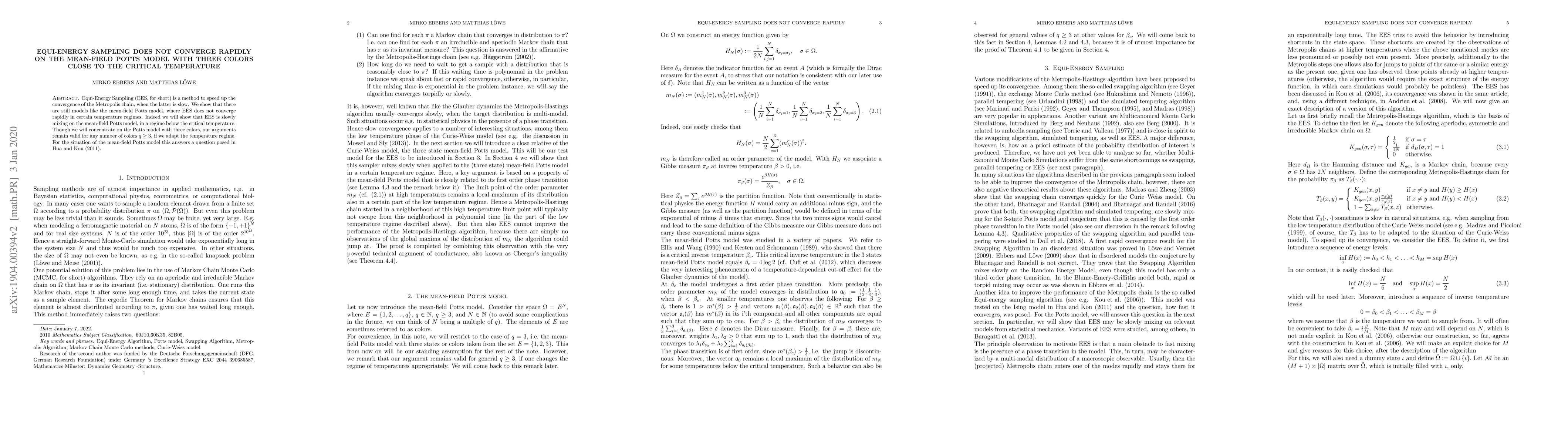 This paper demonstrates that Equi-Energy Sampling (EES) does not accelerate convergence for the mean-field Potts model with three colors near the critical temperature, showing slow mixing in certain temperature regimes. The findings apply to Potts models with any number of colors $q \ge 3$ when adjusted for temperature.