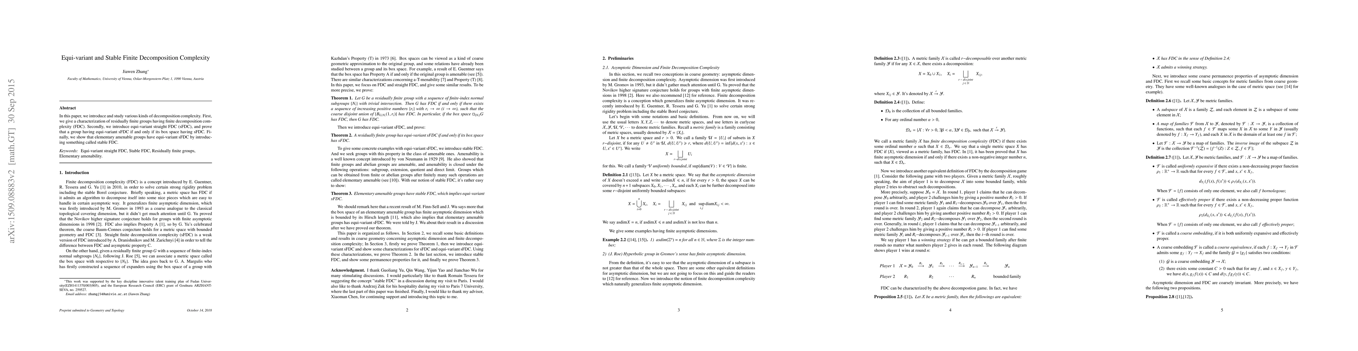 This paper characterizes residually finite groups with finite decomposition complexity (FDC), introduces equi-variant straight FDC (sFDC), and proves its equivalence with sFDC in box spaces. It also demonstrates that elementary amenable groups possess equi-variant sFDC through the concept of stable FDC.