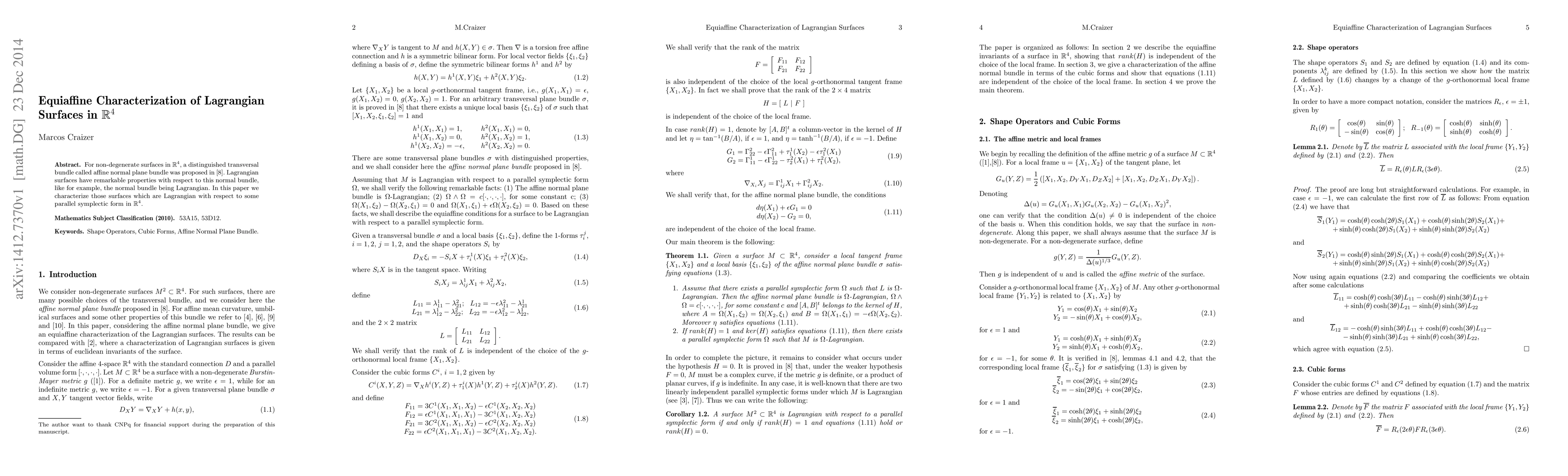 This paper explores Lagrangian surfaces in $R^4$, focusing on their equiaffine properties and the Lagrangian nature of their affine normal plane bundle, ultimately characterizing them with respect to a parallel symplectic form.