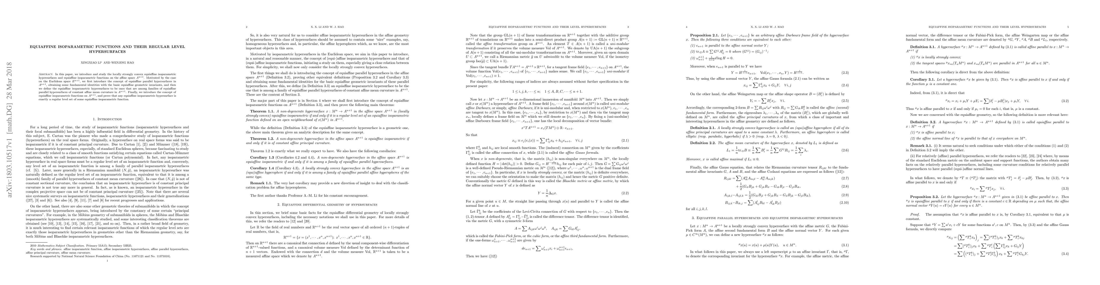 This paper explores locally strongly convex equiaffine isoparametric hypersurfaces in affine space $A^{n+1}$, defining equiaffine isoparametric functions and proving that equiaffine isoparametric hypersurfaces are regular level sets of these functions. It extends concepts from Euclidean space to the affine setting.