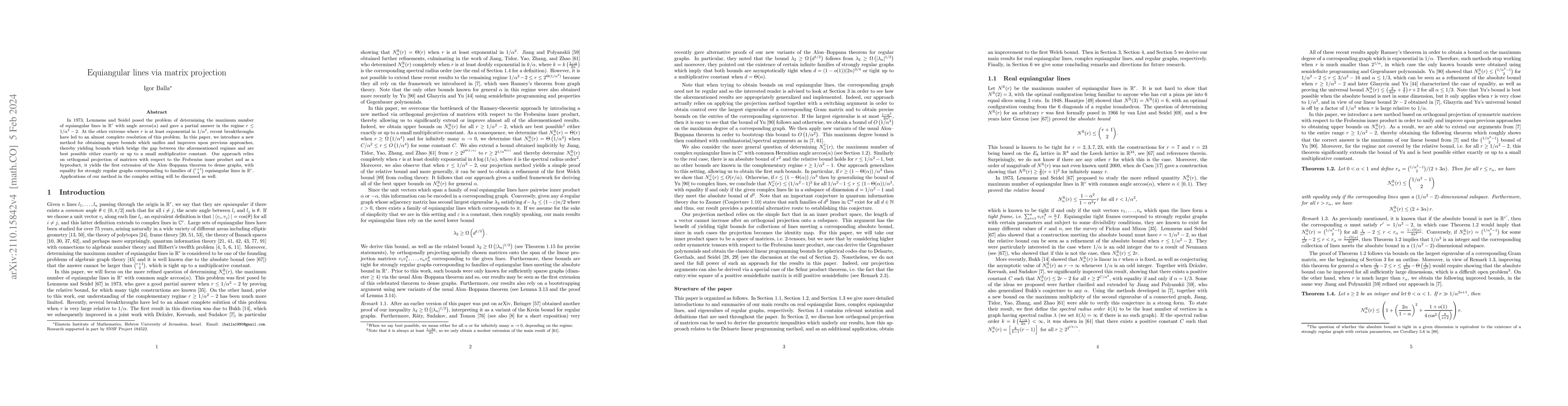 This paper presents a new method using matrix projection to obtain improved upper bounds for the maximum number of equiangular lines in $\mathbb{R}^r$, bridging gaps in previous results and extending the Alon-Boppana theorem to dense graphs. The approach leverages the Frobenius inner product and is best possible up to a small constant.