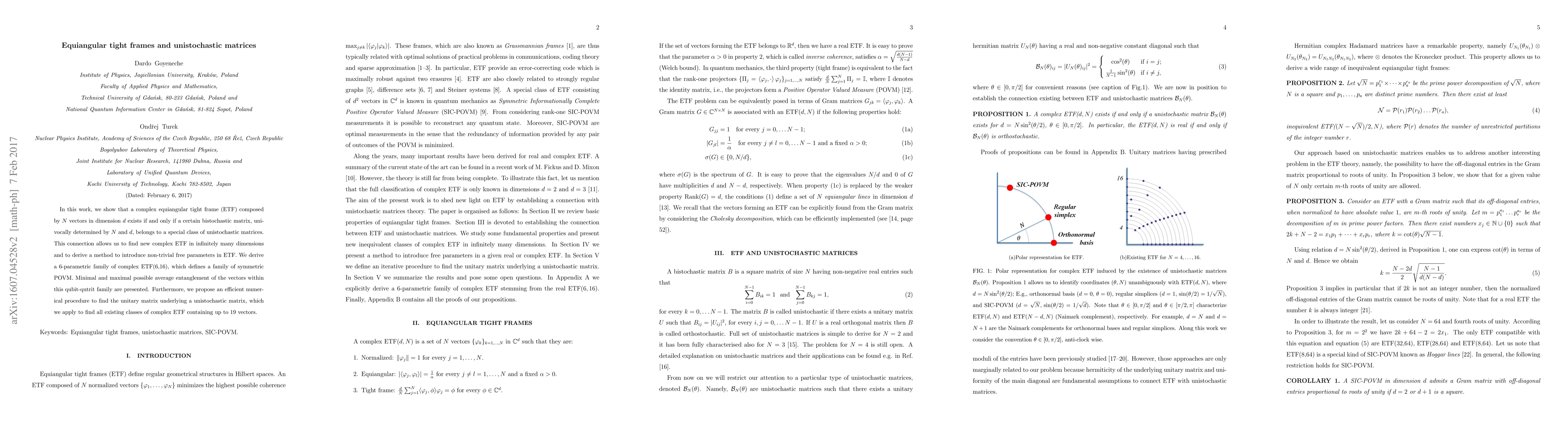 In this work, we show that a complex equiangular tight frame (ETF) composed by $N$ vectors in dimension $d$ exists if and only if a certain bistochastic matrix, univocally determined by $N$ and $d$, belongs to a special class of unistochastic matrices. This connection allows us to find new complex ETF in infinitely many dimensions and to derive a method to introduce non-trivial free parameters in ETF. We derive a 6-parametric family of complex ETF(6,16), which defines a family of symmetric POVM. Minimal and maximal possible average entanglement of the vectors within this qubit-qutrit family are presented. Furthermore, we propose an efficient numerical procedure to find the unitary matrix underlying a unistochastic matrix, which we apply to find all existing classes of complex ETF containing up to 19 vectors.