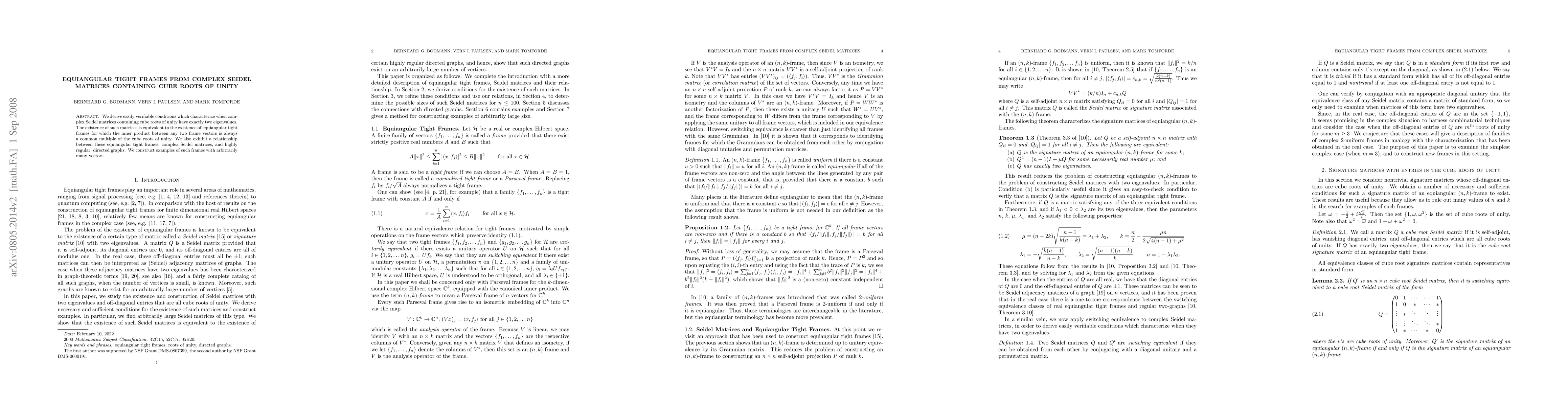 This paper establishes conditions for complex Seidel matrices with cube roots of unity to have exactly two eigenvalues, which corresponds to the existence of equiangular tight frames where frame vectors' inner products are multiples of these cube roots. It also links these frames to highly regular, directed graphs.