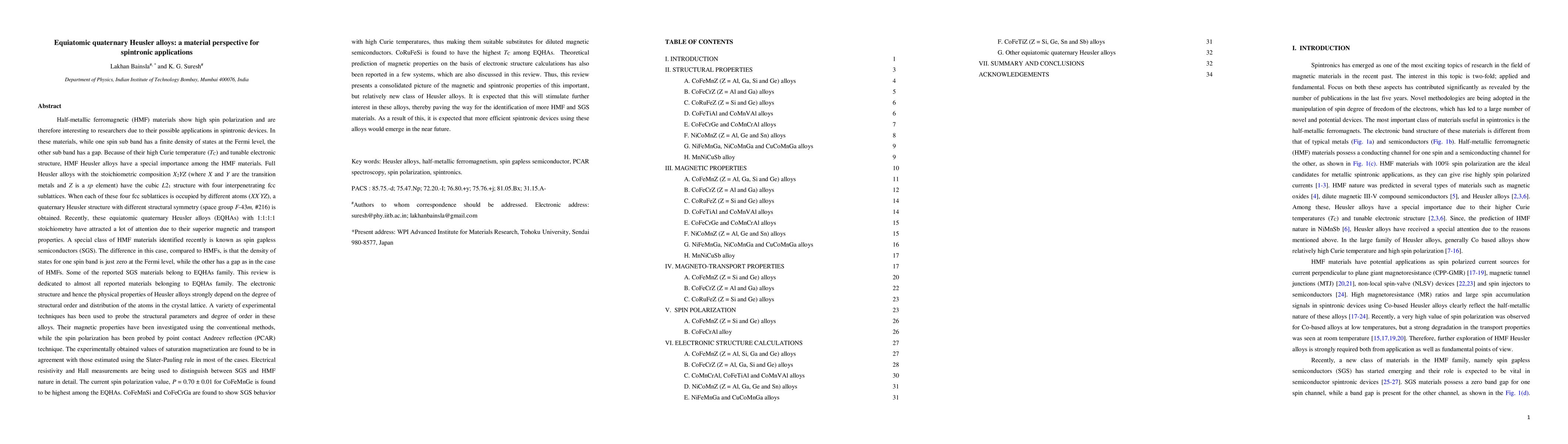 Summary: This paper explores the potential of equiatomic quaternary Heusler alloys (EQHAs) as promising materials for spintronic applications due to their half-metallic ferromagnetic properties, high spin polarization, and tunable electronic structure. These alloys, characterized by their unique quaternary composition and structural symmetry, exhibit superior magnetic and transport properties, making them highly relevant for future spintronic devices.