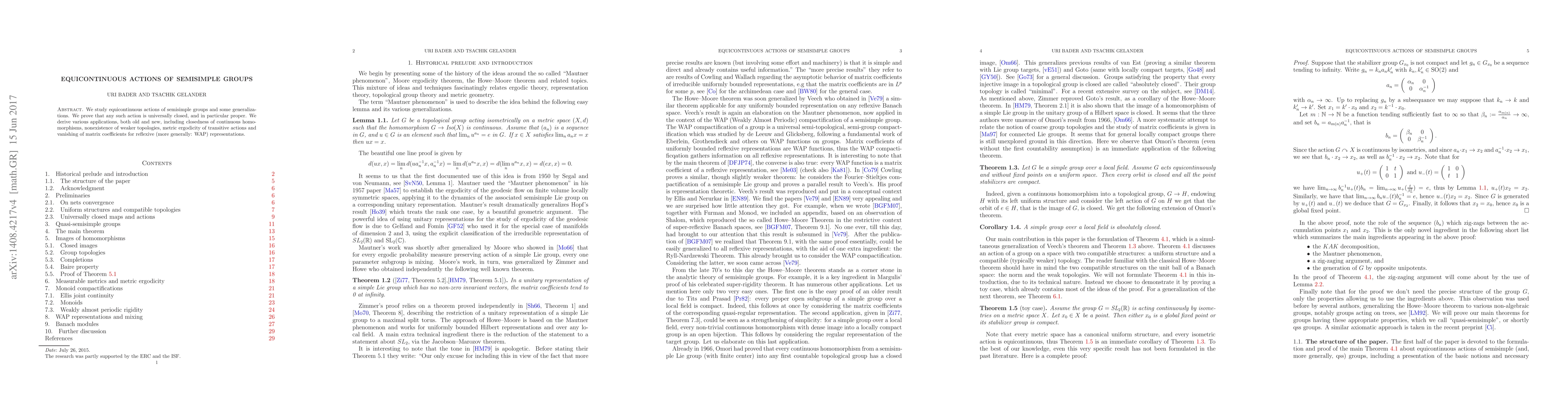 This paper investigates equicontinuous actions of semisimple groups, proving they are universally closed and proper. It also explores applications such as the closedness of continuous homomorphisms and the vanishing of matrix coefficients for reflexive representations.