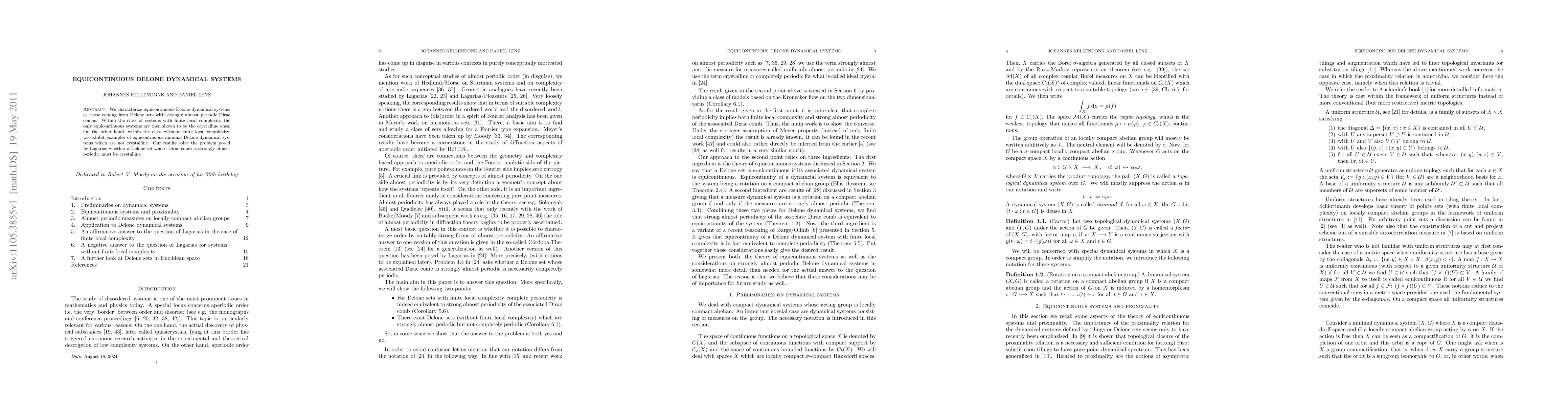 We characterize equicontinuous Delone dynamical systems as those coming from Delone sets with strongly almost periodic Dirac combs. Within the class of systems with nite local complexity the only equicontinuous systems are then shown to be the crystalline ones. On the other hand, within the class without nite local complexity, we exhibit examples of equicontinuous minimal Delone dynamical systems which are not crystalline. Our results solve the problem posed by Lagarias whether a Delone set whose Dirac comb is strongly almost periodic must be crystalline.