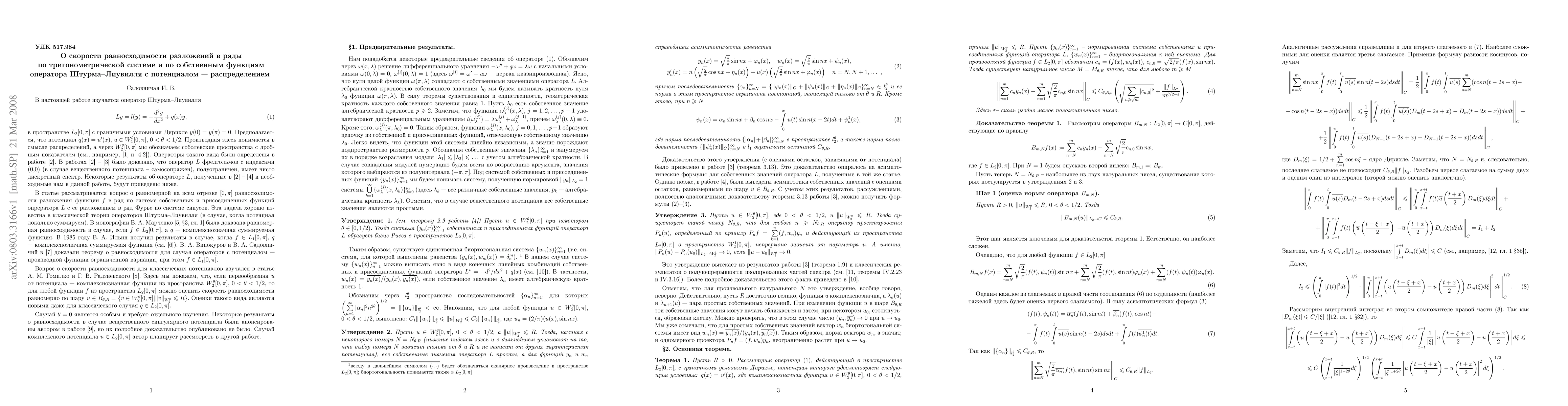 We consider a Sturm--Liouville operator $Ly=-y''+qy$ in $L_2[0,\pi]$ with Dirichlet boundary conditions. We assume, that the potential $q$ is complex valued and belongs to Sobolev space $W_2^\theta[0,\pi]$, $\theta\in(-1,-1/2$. This operators were successfully defined in papers of Savchuk A.M. and Shkalikov A.A. There were also shown, that theese operators have a discrete spectrum, which we denote by $\{\lambda_n\}$, and $\lim\lambda_n=+\infty$. All but finitely many of them are simple. The eigenfunctions form the Riesz basis in $L_2[0,\pi]$. We investigate a uniform on $[0,\pi]$ equiconvergence of series for this system and for trigonometric system $\{\sin(nt)\}_1^\infty$. We obtain not only a theorems of equiconvergence, but also estimate a rate of this equiconvergence.