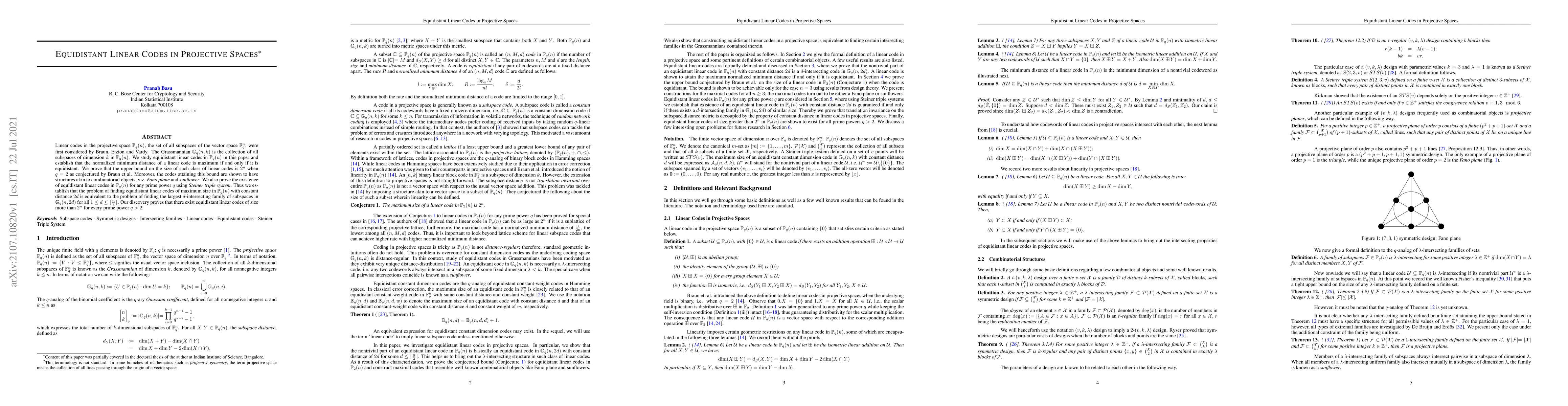 Linear codes in the projective space $\mathbb{P}_q(n)$, the set of all subspaces of the vector space $\mathbb{F}_q^n$, were first considered by Braun, Etzion and Vardy. The Grassmannian $\mathbb{G}_q(n,k)$ is the collection of all subspaces of dimension $k$ in $\mathbb{P}_q(n)$. We study equidistant linear codes in $\mathbb{P}_q(n)$ in this paper and establish that the normalized minimum distance of a linear code is maximum if and only if it is equidistant. We prove that the upper bound on the size of such class of linear codes is $2^n$ when $q=2$ as conjectured by Braun et al. Moreover, the codes attaining this bound are shown to have structures akin to combinatorial objects, viz. \emph{Fano plane} and \emph{sunflower}. We also prove the existence of equidistant linear codes in $\mathbb{P}_q(n)$ for any prime power $q$ using \emph{Steiner triple system}. Thus we establish that the problem of finding equidistant linear codes of maximum size in $\mathbb{P}_q(n)$ with constant distance $2d$ is equivalent to the problem of finding the largest $d$-intersecting family of subspaces in $\mathbb{G}_q(n, 2d)$ for all $1 \le d \le \lfloor \frac{n}{2}\rfloor$. Our discovery proves that there exist equidistant linear codes of size more than $2^n$ for every prime power $q > 2$.