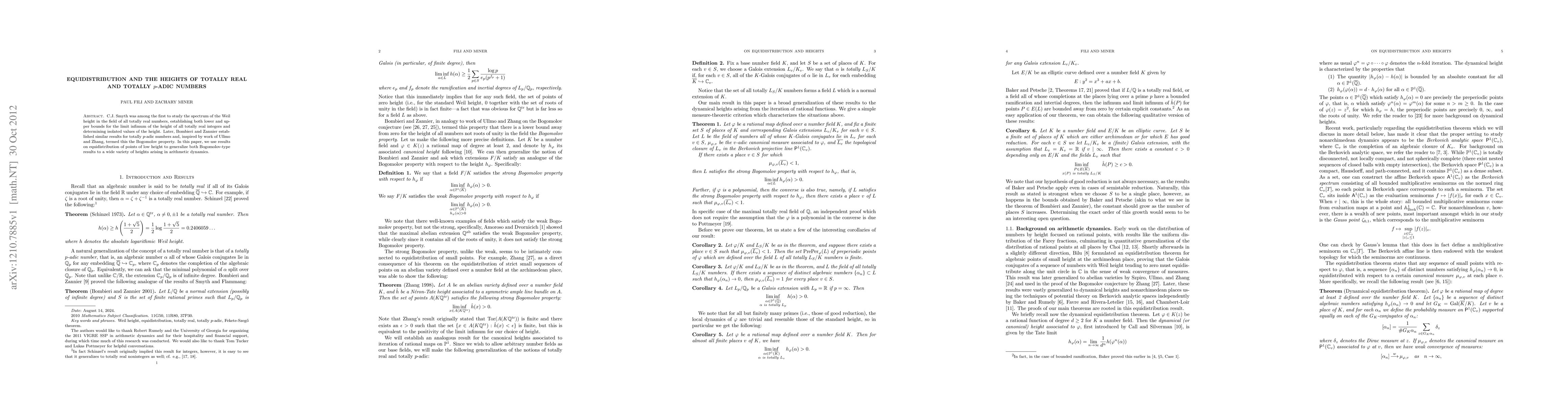 This paper generalizes Bogomolov-type results on the equidistribution of low-height points to various heights in arithmetic dynamics, building on Smyth's foundational work on the Weil height for totally real numbers and Bombieri-Zannier's results for totally p-adic numbers.