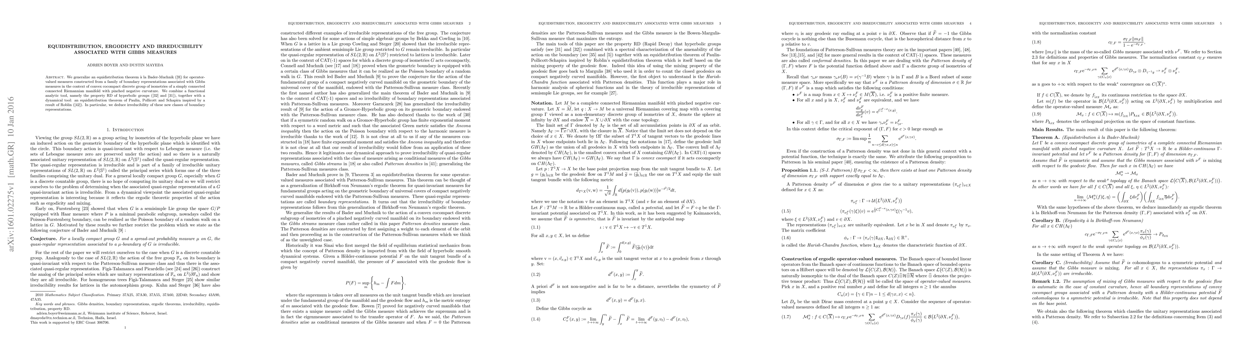 Researchers generalized an equidistribution theorem for Gibbs measures in simply connected Riemannian manifolds with pinched negative curvature, combining functional analysis and dynamical tools to deduce irreducibility of boundary representations.