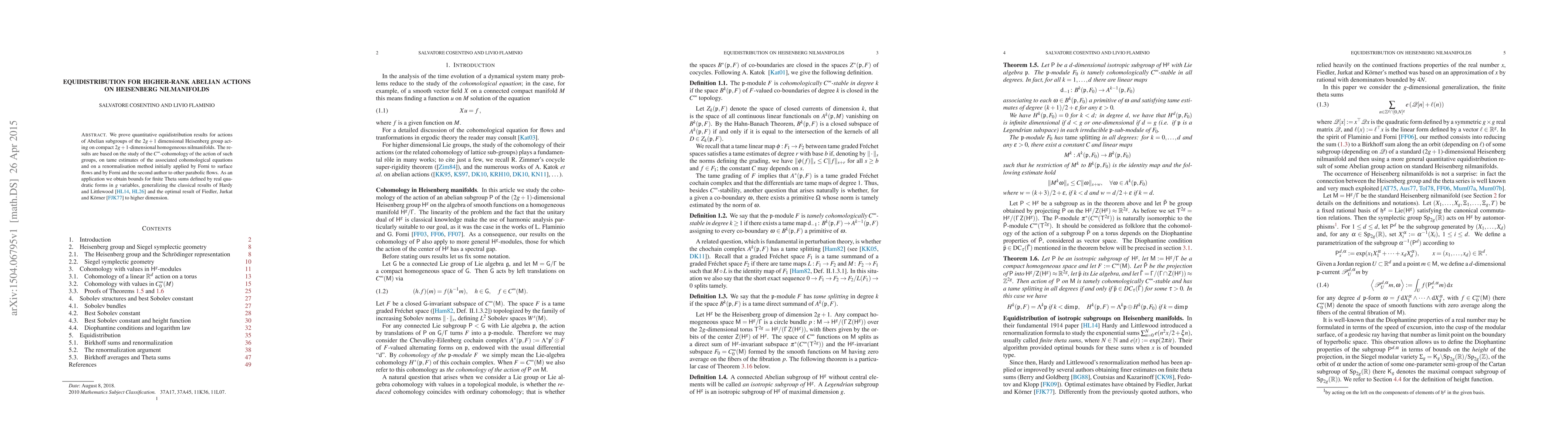 We prove quantitative equidistribution results for actions of Abelian subgroups of the $2g+1$ dimensional Heisenberg group acting on compact $2g+1$-dimensional homogeneous nilmanifolds. The results are based on the study of the $C^\infty$-cohomology of the action of such groups, on tame estimates of the associated cohomological equations and on a renormalisation method initially applied by Forni to surface flows and by Forni and the second author to other parabolic flows. As an application we obtain bounds for finite Theta sums defined by real quadratic forms in $g$ variables, generalizing the classical results of Hardy and Littlewood \cite{MR1555099, MR1555214} and the optimal result of Fiedler, Jurkat and K\"orner \cite{MR0563894} to higher dimension.