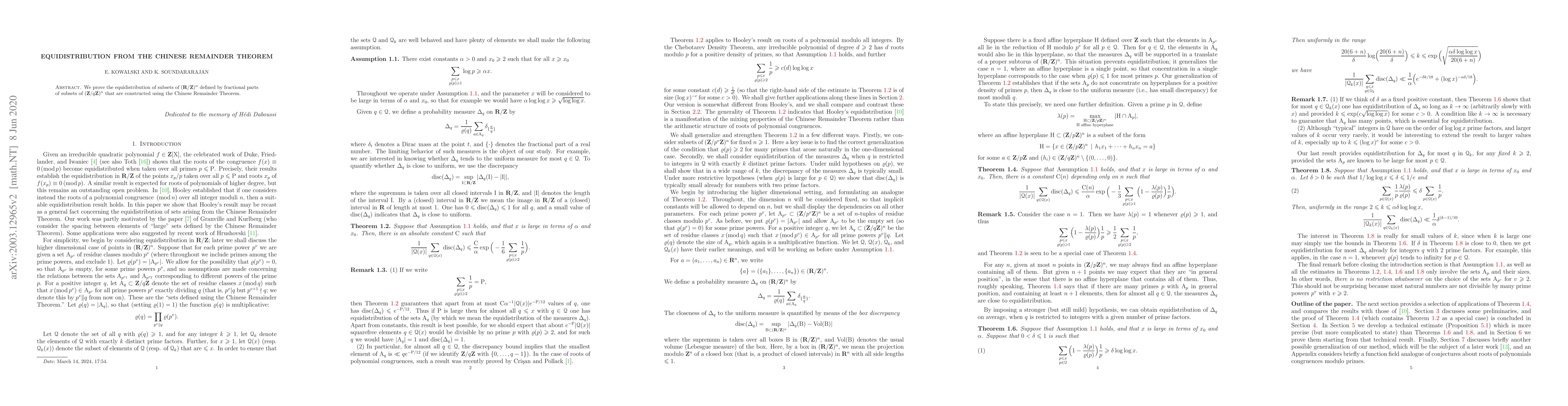We prove the equidistribution of subsets of $(\Rr/\Zz)^n$ defined by fractional parts of subsets of~$(\Zz/q\Zz)^n$ that are constructed using the Chinese Remainder Theorem.