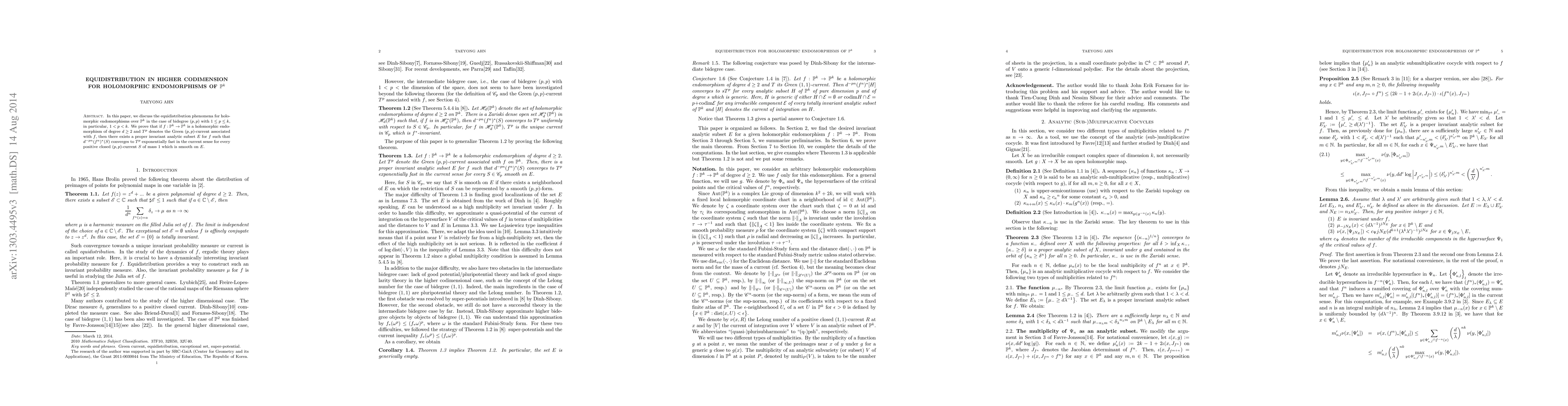This paper investigates equidistribution for holomorphic endomorphisms of projective space $\mathbb{P}^k$ of bidegree $(p,p)$ with $1<p<k$. The authors prove that under certain conditions, the iterates of the endomorphism converge exponentially to a proper invariant analytic subset.